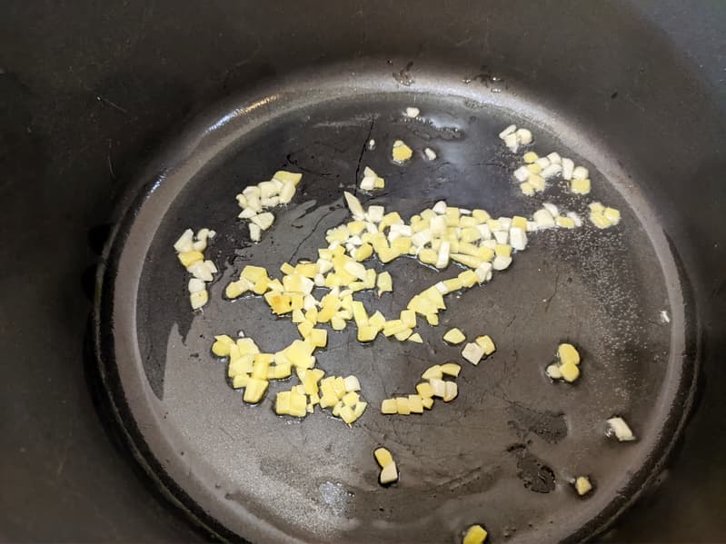 Ну а дальше — вооружились кастрюлей типа казана, прогрели его и начали последовательно обжаривать остальные ингредиенты. Сначала чеснок с имбирем...
