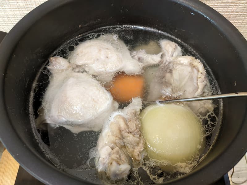 Бульон мы варим простой и незамысловатый. Мы поместили в кастрюлю несколько куриных окорочков, добавили к ним луковицу, соль и залили водой. Выбрали самую большую зону нагрева и максимальную мощность, а когда приблизились к точке закипания, стали постепенно уменьшать мощность плиты.