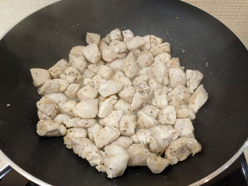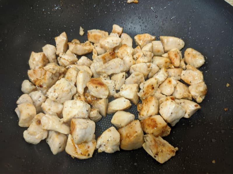 Для начала обжарили кусочки курицы. В первые минуты выделилось заметное количество влаги (подозреваем, что мясо попалось не лучшего качества, нашприцованное водным рассолом).