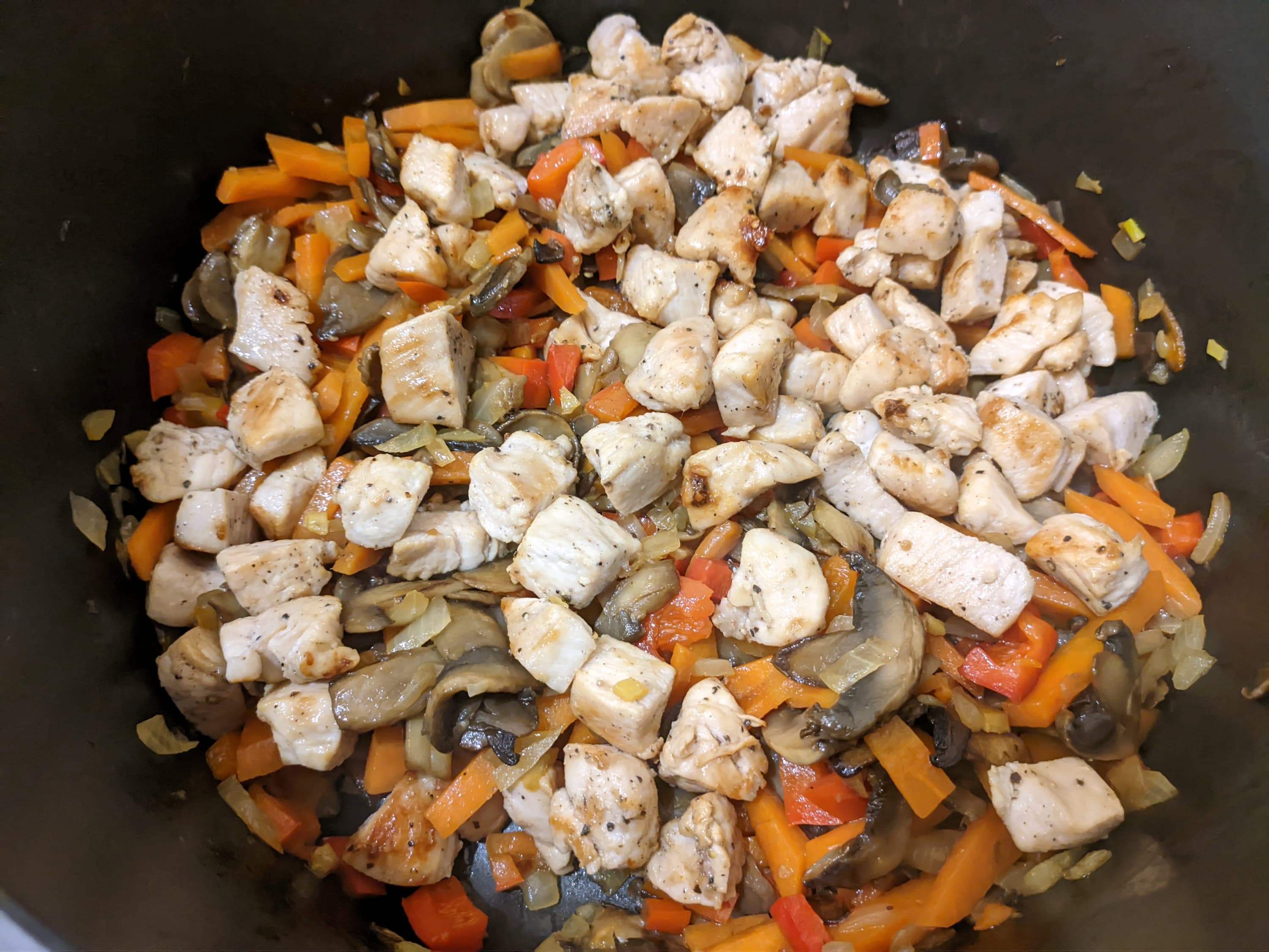 На последнем этапе добавляем готовую курицу и снова перемешиваем.