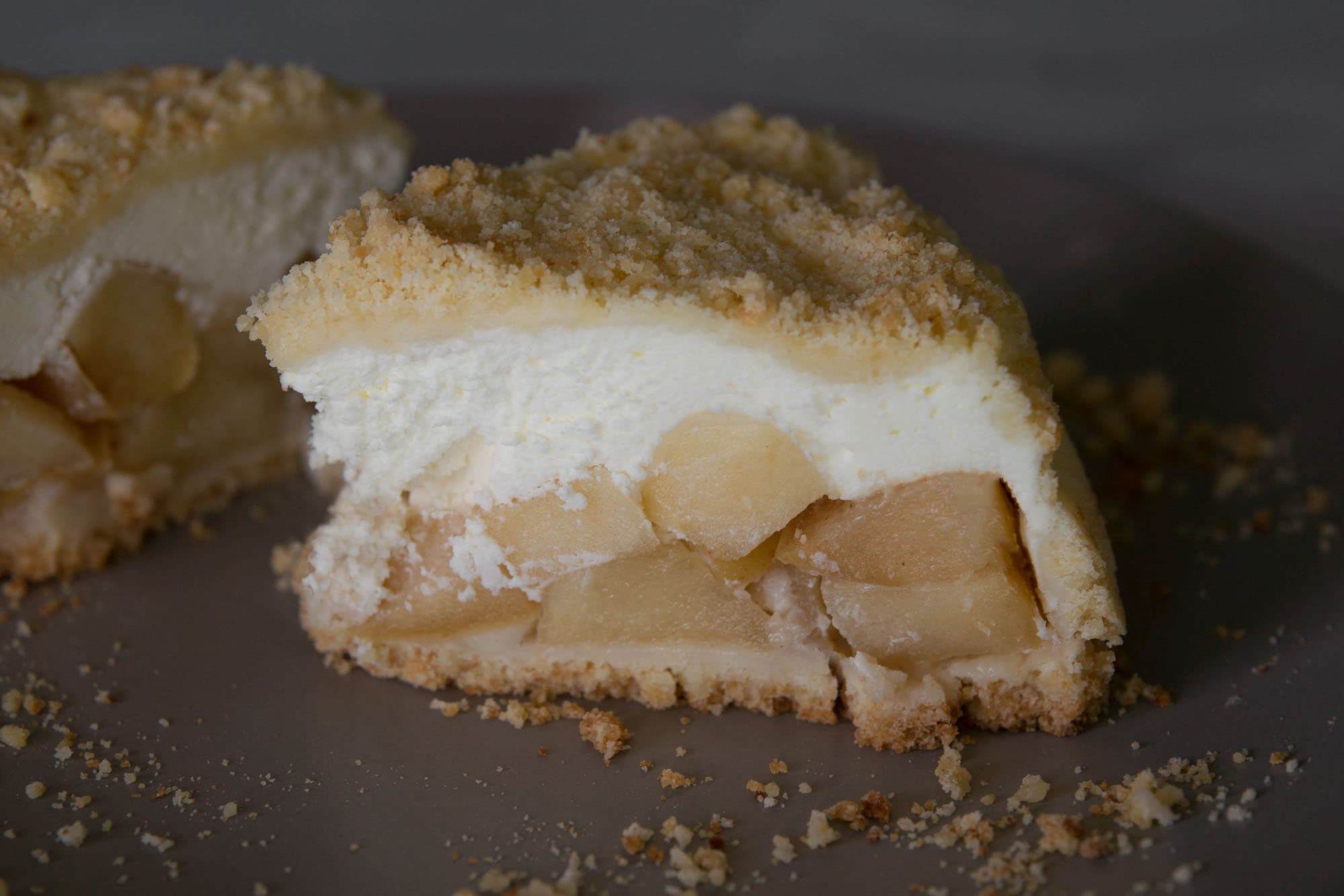 Пока духовка разогревалась до 170 °C в режиме верхнего и нижнего нагрева, мы занялись сборкой пирога. Достали форму с тестом из холодильника и выложили на дно остывшую яблочную начинку. Сверху распределили сметанный крем, разровняли и присыпали оставшейся крошкой.