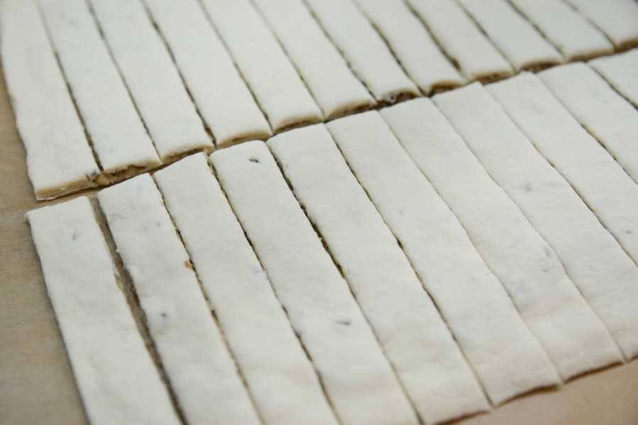 Разрезали заготовку на одинаковые прямоугольники и, сворачивая каждый по спирали, выложили на противень, застеленный пекарской бумагой. Обмазали будущие слойки яичным желтком и поставили емкость в духовку, предварительно разогретую до 220 °C в режиме верх+низ.