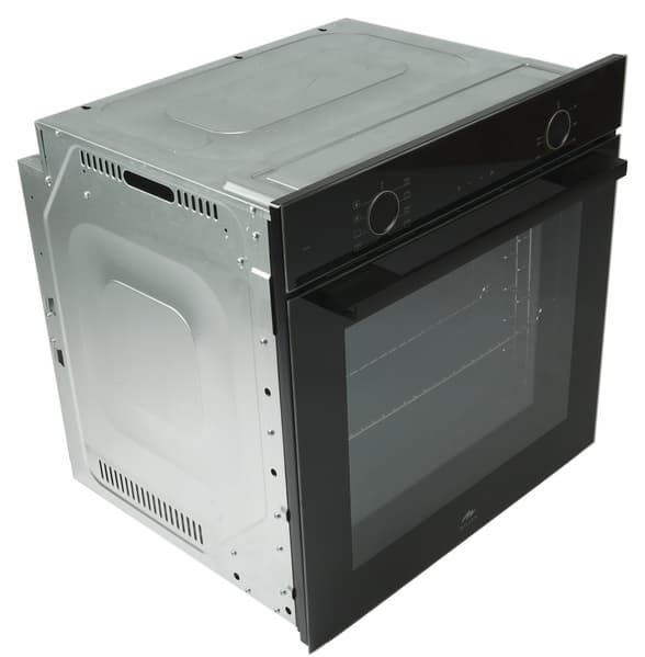 Духовой шкаф Millen MEO 6002 BB появился у нас в лаборатории в пенопластовом коробе, обтянутом полиэтиленом. По центру фронтальной части конструкция усилена прочной пластиковой планкой. Справа вверху размещена наклейка с информацией об устройстве.