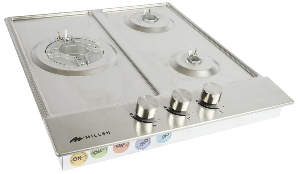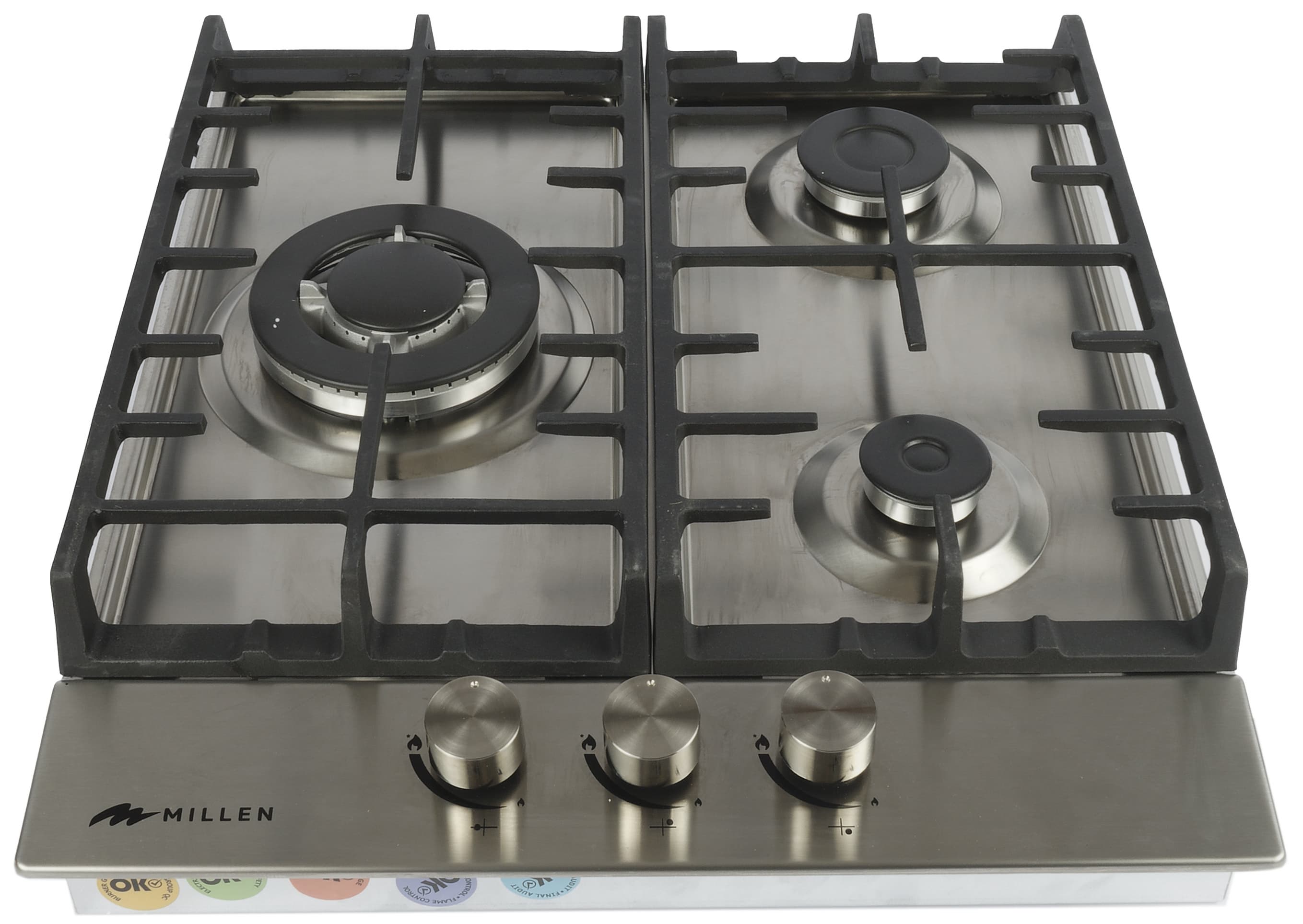 Газовая варочная панель Millen MGH 451 IX имеет лаконичный строгий дизайн, элементарна в уходе, удобна в управлении и эксплуатации. Устройство рассчитано на приготовление в трех емкостях одновременно, если диаметр посуды, установленной на самой большой конфорке, не превышает 23-25 см, тогда на соседних двух есть место для емкостей размером до 19 см каждая.
