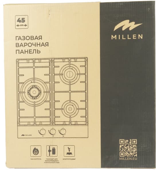 Варочная поверхность Millen MGH 451 IX поставляется в плоской картонной коробке со схематическим изображением устройства, обозначением его трех ключевых особенностей и QR-кодом ведущим на официальный сайт компании. Внутри плита надежно удерживается в неподвижном состоянии пенопластовыми вкладками.