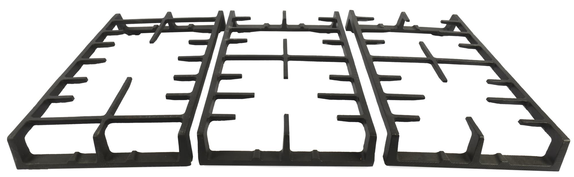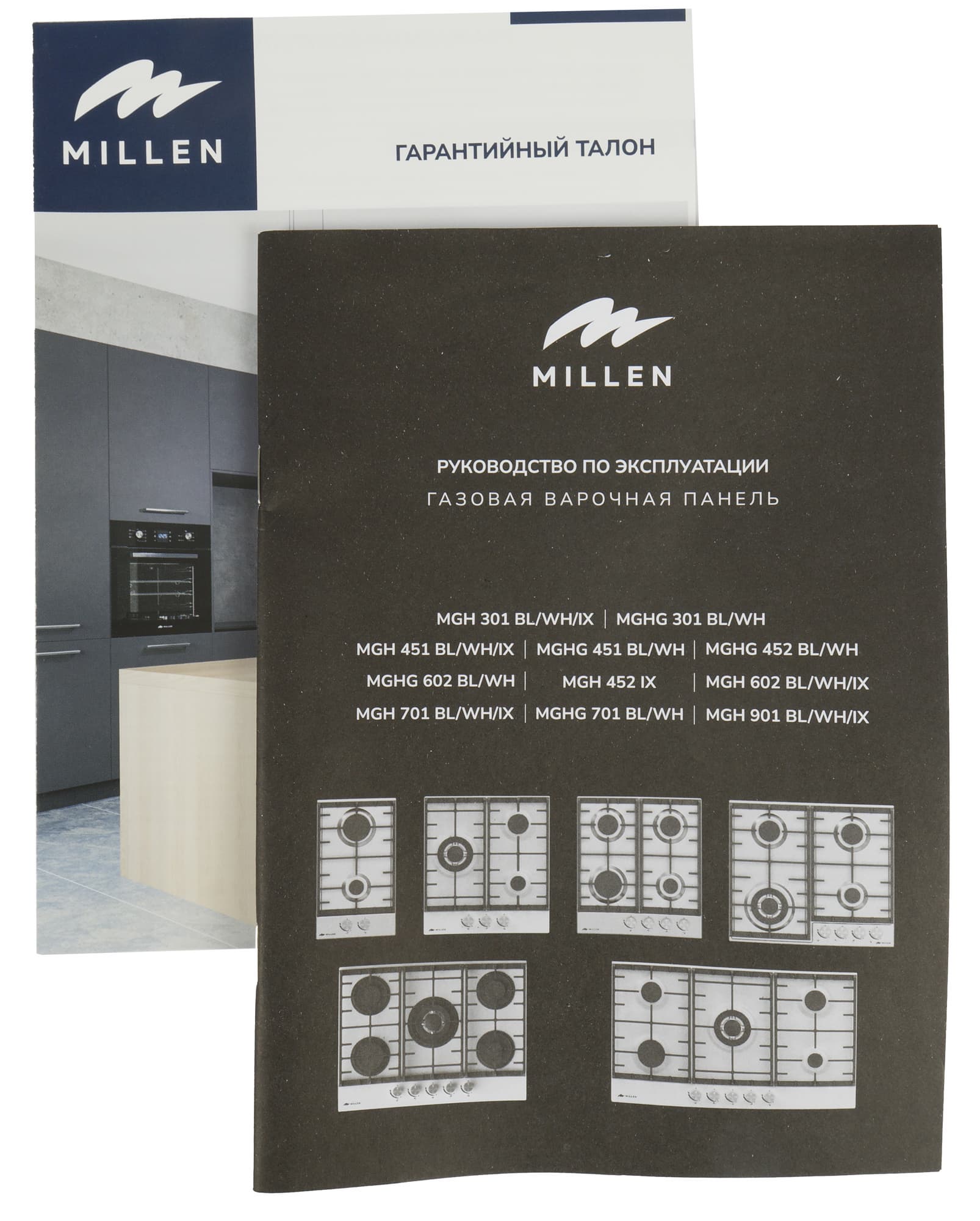 Решетка Millen MGH 701 BL состоит из трех прямоугольных чугунных секций, две из которых идентичны и взаимозаменяемы. Не смотря на то, что диаметр конфорок различается, расстояние разрыва решеток для четырех конфорок одинаковое и составляет приблизительно 9,2×9,2 см. Края решеток слегка скошены, что немного уменьшает их размер сверху. Полезный размер установленных всех трех секций решетки составляет 40×68,5 см.