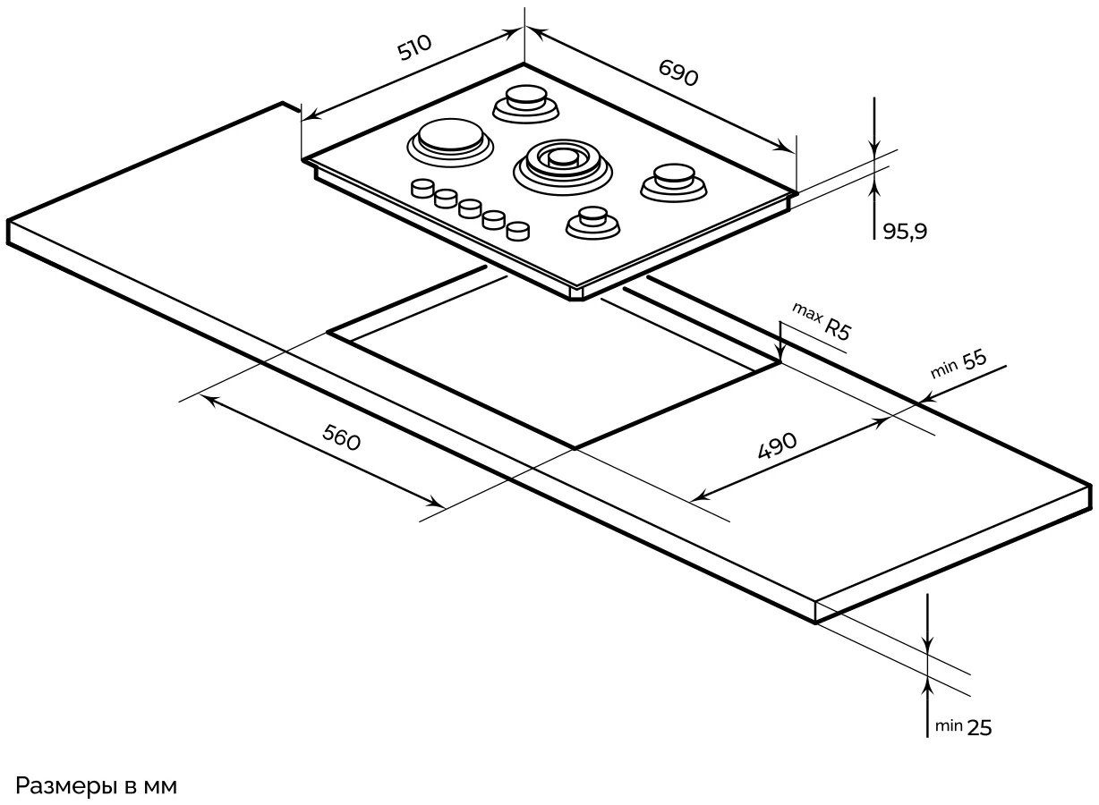 При монтаже плиты нужно учитывать рекомендованные минимальные зазоры до боковой или задней стены в 55 мм. Расстояние между нижней частью устройства и любой поверхностью под ней — не менее 25 мм.