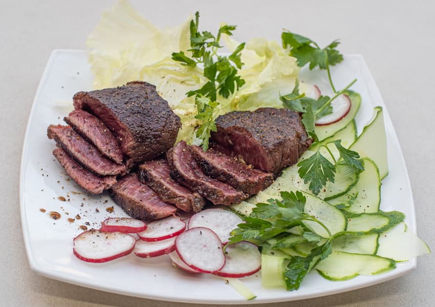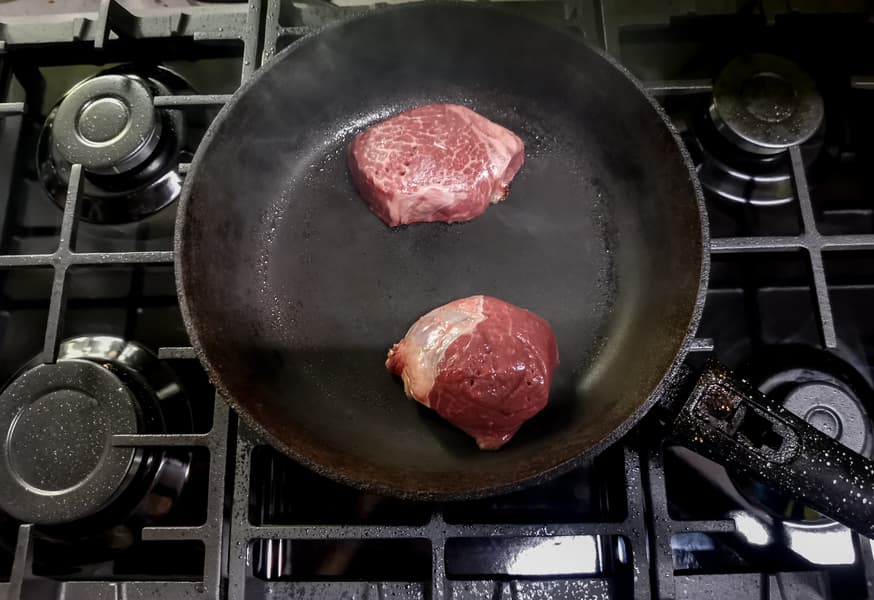 Вот для чего вок-конфорка подошла идеально, так это для жарки стейка. Мы взяли говяжьи медальоны и отправили их на разогретую сковородку.