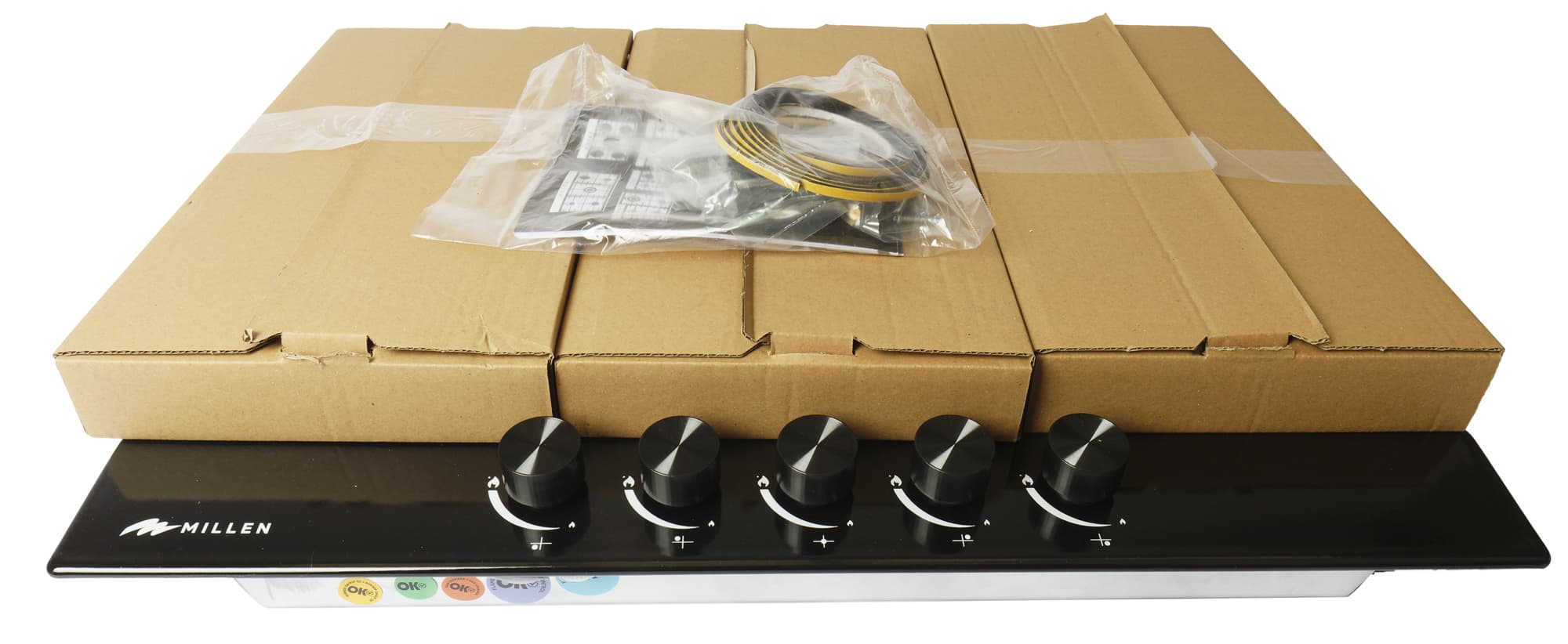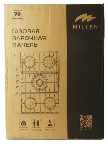 Газовая варочная поверхность Millen MGH 701 BL приехала на тесты в аккуратной коробке из толстого картона. На коробке черным цветом нанесено схематическое изображение прибора, название и служебные пиктограммы, ручек и прорезей конструкцией не предусмотрено. Внутри поверхность надежно зафиксирована пенопластовыми вставками. Сбоку наклейка с номером модели и техническими характеристиками, дополненная штрих-кодами.