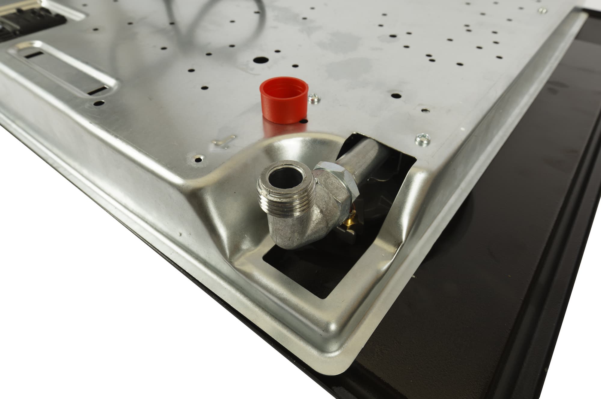 С обратной стороны плиты выходит шнур подключения. Шнур укомплектован вилкой несмотря на то, что плита рассчитана на встраивание и постоянное подключение. Снизу сбоку выходит газовая труба для подключения к газу, магистральному или баллонному.