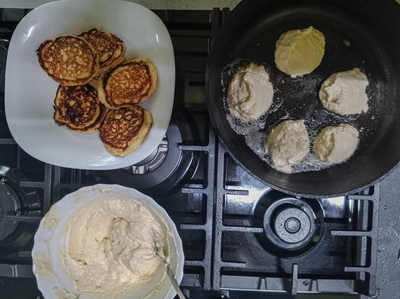 Из творога, яиц, муки и сахара мы приготовили стандартное тесто для сырников. Жарили на конфорке 1,75 кВт.