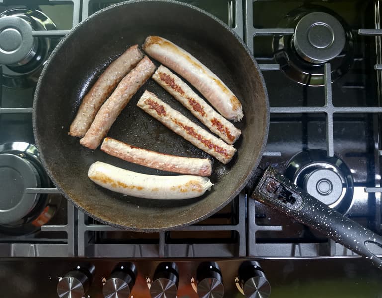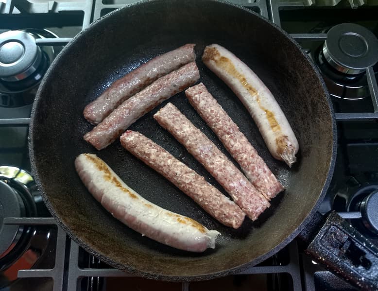 Сосиски и колбаски для жарки мы положили на сковородку диаметром 28 см и поставили на вок-конфорку. Как показала практика, такой мощности оказалось слишком много для нормальной прожарки.