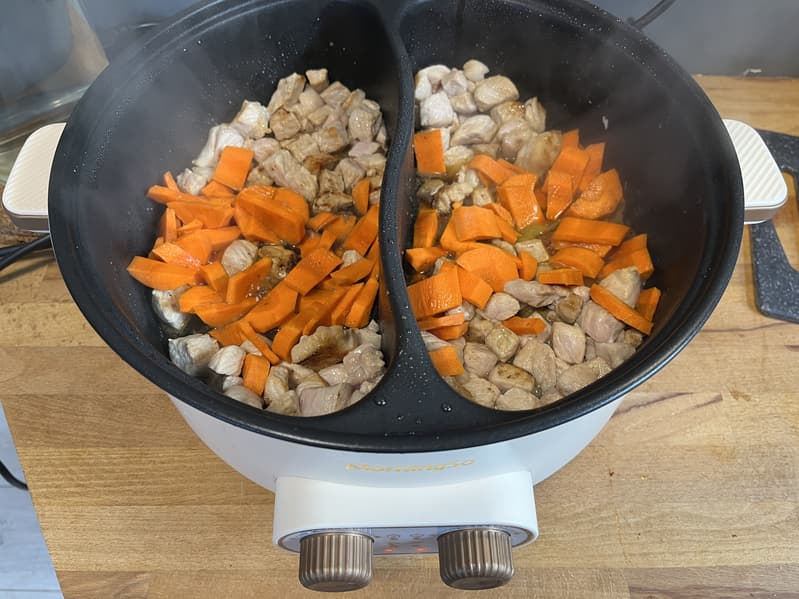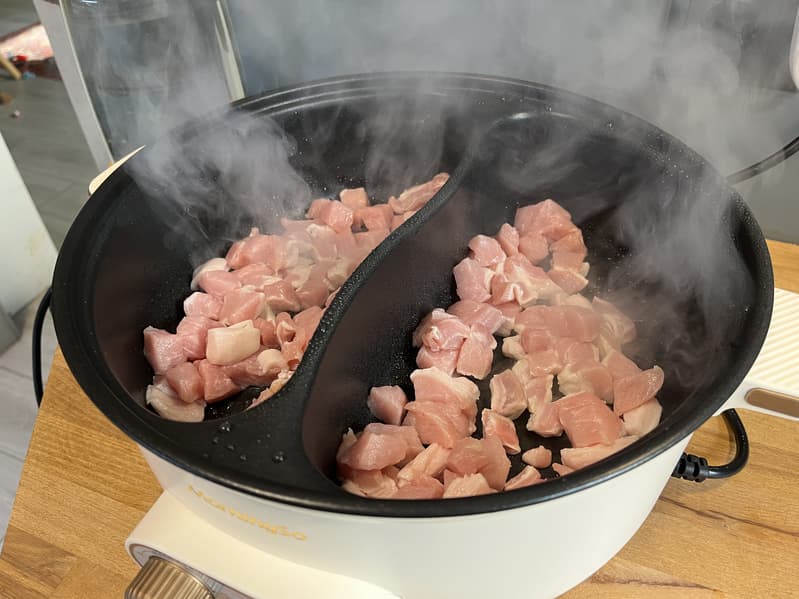 Добавили в наши отсеки растительное масло и принялись за быструю обжарку свинины. Некоторые кусочки, которые чаще попадали в середину, получились более зажаристыми, но ничего критичного в этот раз не случилось.