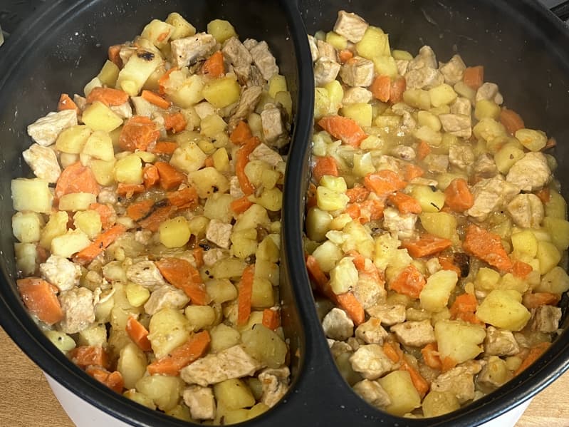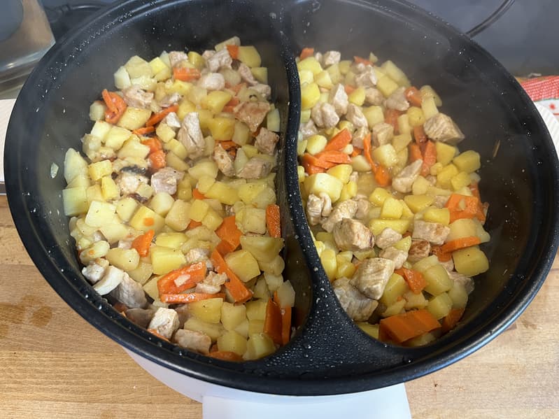 За 25 минут рагу полностью приготовилось, и так как мы его часто перемешивали и добавляли жидкость, подгоревших кусочков почти не оказалось. Можно сказать, что мы победили электрокастрюлю.