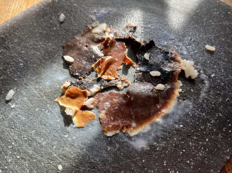 К концу приготовления, когда всё молоко выпарилось, у нас уже образовалась целая коллекция пригоревших корочек со дна.