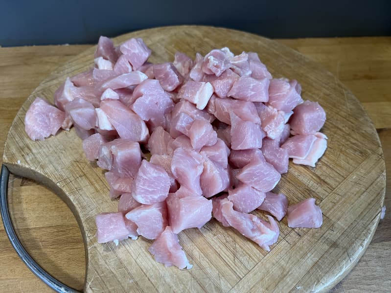 К этому моменту подготовили мясо. Нарезали свинину на мелкие кусочки — опять же потому, что боялись сложностей из-за неравномерного нагрева.