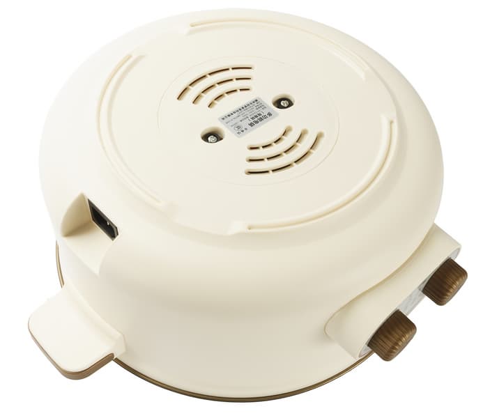 На дне электрокастрюли мы видим большое количество мелких технических и вентиляционных отверстий и шильдик с краткой технической информацией в центре.