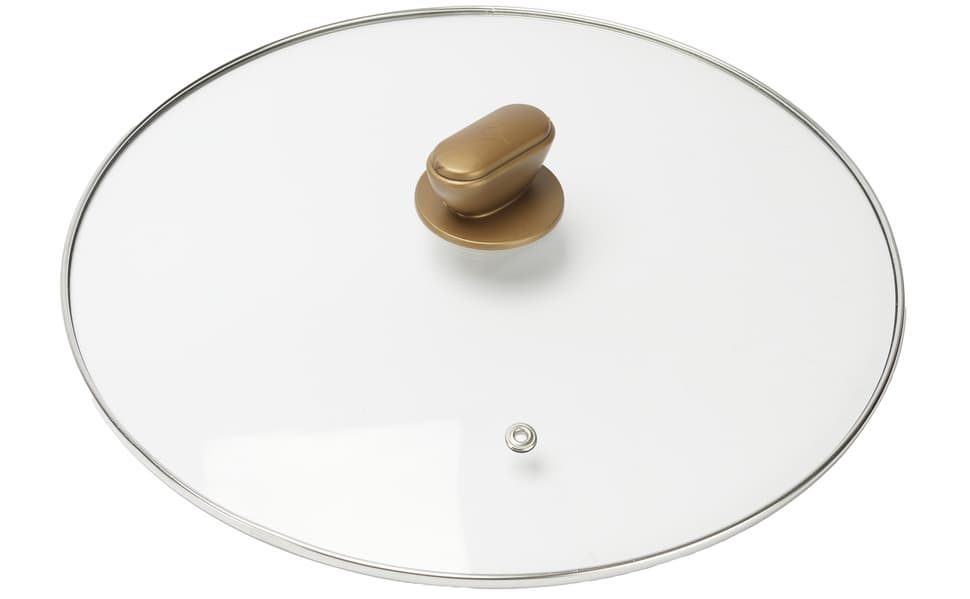 Крышка сделана из прозрачного стекла и имеет металлический ободок по периметру. Сбоку находится отверстие для выхода пара, а в центре достаточно удобная пластиковая ручка, закрепить которую нужно самостоятельно с помощью болта в комплекте.