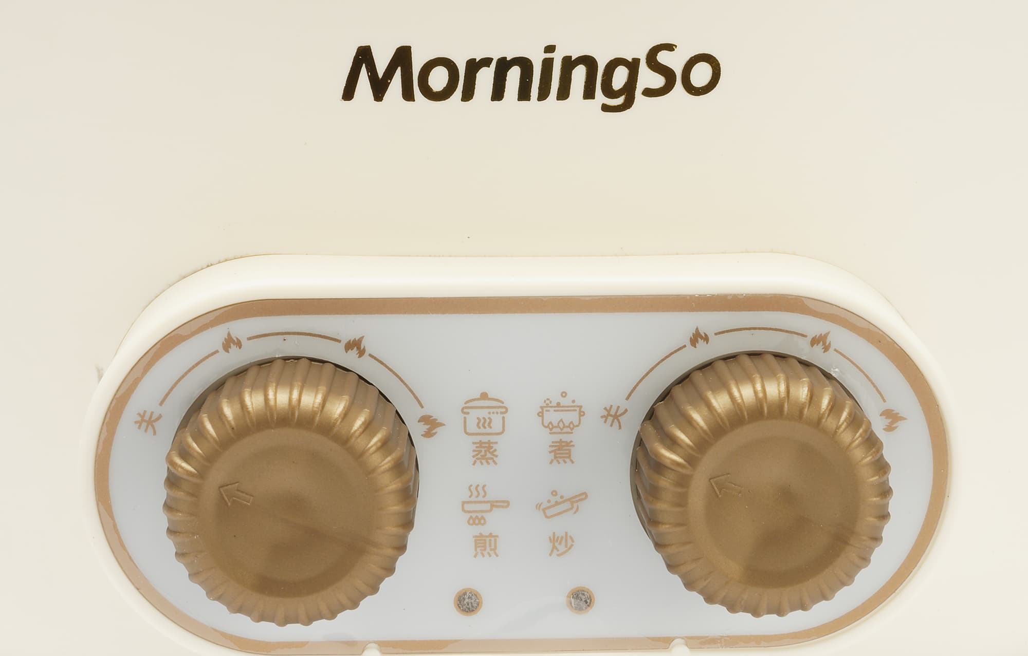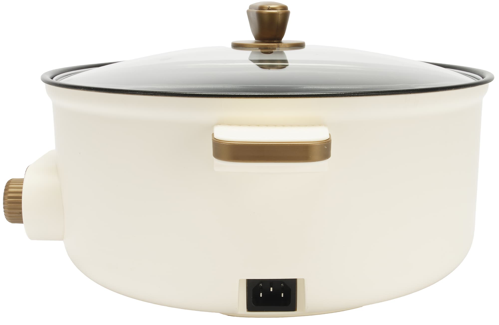 Внешне прибор выглядит весьма стильно — металлический корпус кремово-белого цвета с желтым логотипом спереди, пластиковые широкие белые рифленые ручки-ушки с золотистыми вставками, небольшая аккуратная панель управления с двумя круглыми переключателями режимов также в золотистом оттенке и стеклянная крышка с ручкой аналогичного цвета.