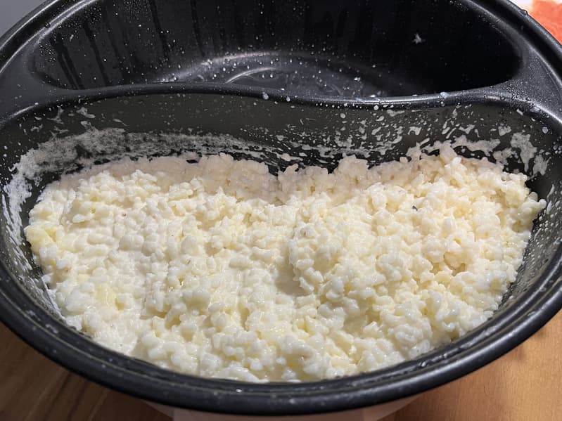 Спустя 15 минут начались первые сложности: молоко в центральной части стало подгорать, образуя корочки на дне. При этом каша даже не доходила до кипения, а рис только начал размягчаться.