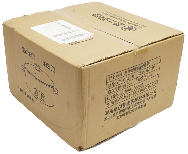 На лицевой оборотной сторонах, помимо схематического изображения кастрюли, мы видим множество китайских иероглифов. Благодаря переводчику узнаем, что прибор может быть в двух цветовых исполнениях — зеленом и белом. У нас оказался второй вариант.