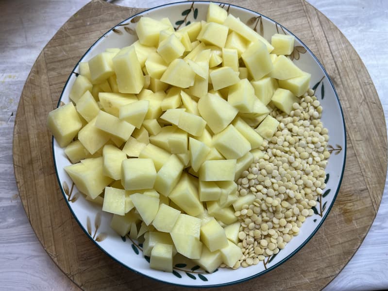 Следом мы добавили морковь и картофель, также порезанные на небольшие кусочки.