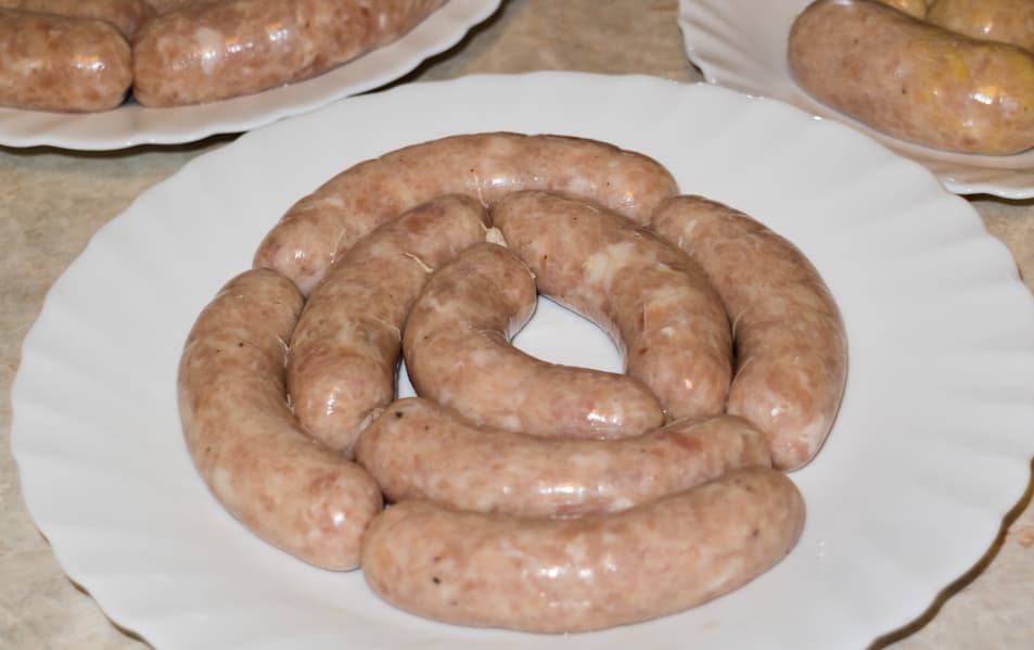 Фарш хорошего качества, состоящий из равномерно порубленного мяса. Посмотрев на него, мы решили изготовить нежные молочные сардельки. Добавили фарш из постной свинины так, чтобы в общей сложности получилось 1,5 кг продукта. Влили полтора стакана молока, всыпали 1,5 ст. л. крахмала, примерно столько же соли, смололи немного черного перца. Хорошо вымешали фарш и оставили его на час для созревания.
