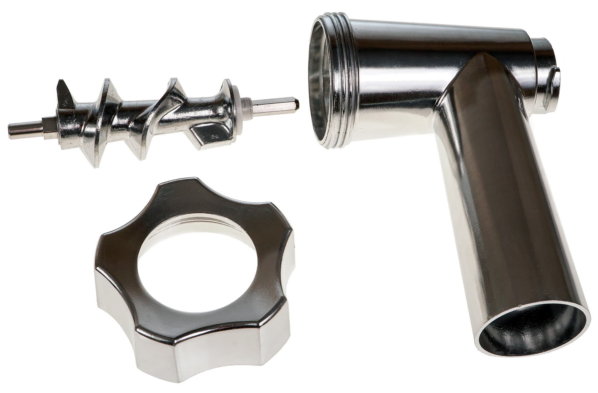 Детали насадки-мясорубки — корпус, шнек и зажимная гайка — изготовлены из алюминия. Самозатачивающийся нож — из нержавеющей стали. Металл обработан хорошо. Поверхности всех деталей гладкие, не заметны следы шлифовки, отливки или облоя. Примечательна форма гайки — деталь массивная и тяжелая. Вероятно такая форма сконструирована для облегчения отвинчивания детали, когда необходимо разобрать мясорубку для мытья. Не секрет, как трудно бывает это сделать. Довольно высока загрузочная горловина мясорубки.