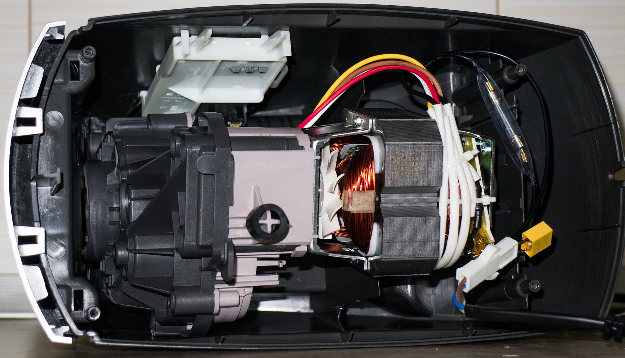 К сожалению, произвести разборку мясорубки нам не удалось. Несмотря на то, что основание корпуса снялось достаточно просто (открутили четыре самореза Т20), далее мы встали в тупик: остальное содержимое корпуса крепится на множестве пластмассовых защелок, освободить которые без повреждений, не имея специальной оснастки и знания об их местонахождении, не представляется возможным.