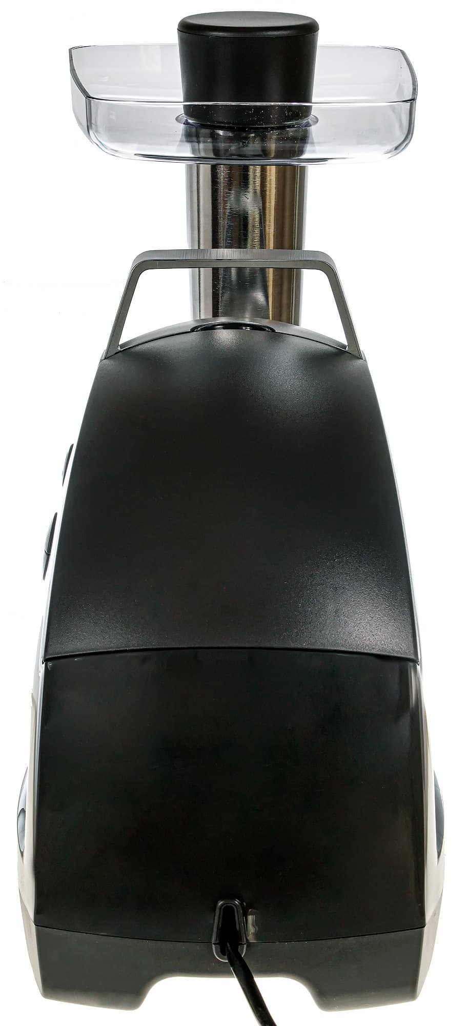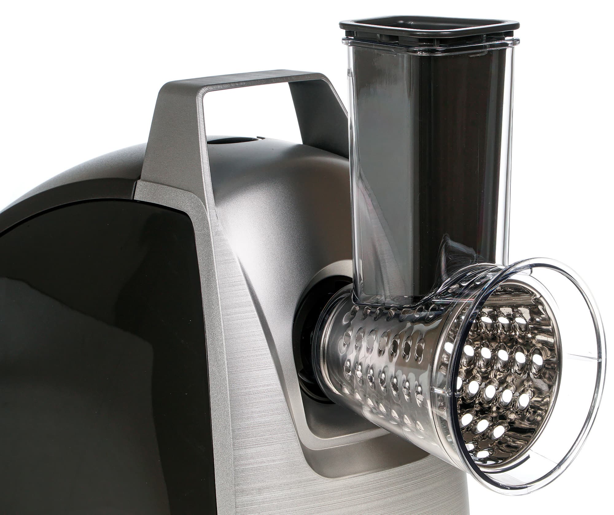 В верхней части мы видим ручку, которая значительно облегчает переноску блока с места на место. Там же находится отсек для аксессуаров. В нем свободно размещаются: незанятая решетка, насадка для кеббе и насадка для изготовления колбас. Отсек для хранения аксессуаров — это довольно важная составляющая удобства при хранении прибора.