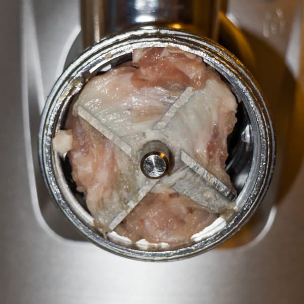 Мясорубке потребовалось всего 15 секунд. Значит, производительность при рубке филе индейки при использовании решетки с крупными отверстиями составляет почти 3 кг/мин. — 2,93. Возможно, если подавать куски быстрее, эффективность тоже возрастет, но, наш взгляд, расти уже некуда. Мы с трудом можем представить себе ситуации при обычном, некоммерческом использовании, когда нужно изготавливать фарш в таких объемах.