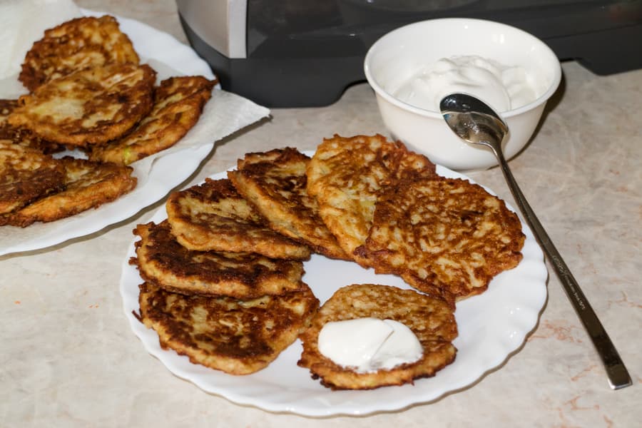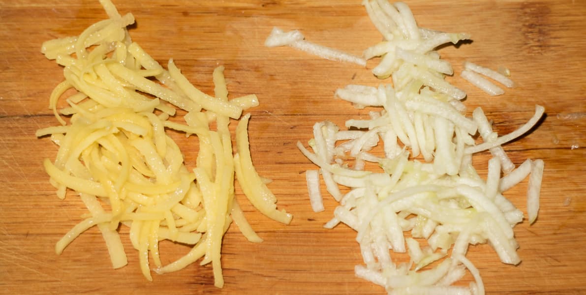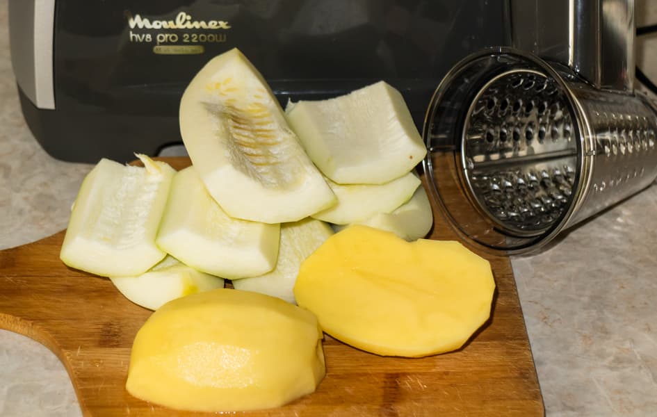 В завершение было решено приготовить картофельно-кабачковые оладьи. Очистили одну крупную картофелину и кабачок. Кабачок нарезали на крупные куски, свободно проходящие в загрузочное отверстие насадки-овощерезки, картофель разрезали пополам.