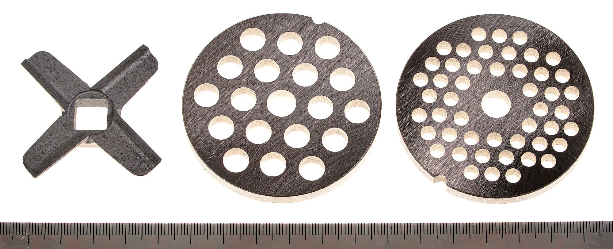 В комплект к прибору входят две стальные решетки: одна со средним с диаметром отверстий (4,5 мм), другая с крупными отверстиями (8 мм). Толщина формовочных дисков — 6 мм. Нож классической формы, лезвия весьма острые. Нож тоже массивный, таким образом имеет запас для заточки. Впрочем, производитель позиционирует лезвия как самозатачивающиеся.