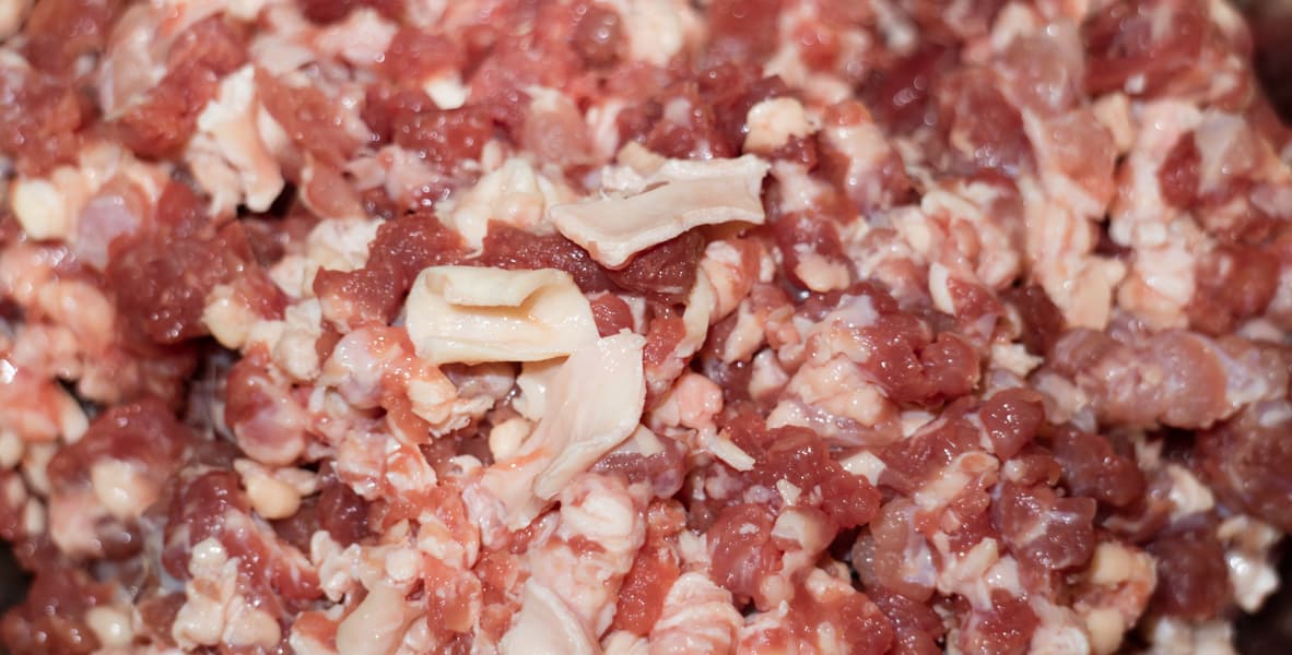 Мясо порублено, а не выдавлено. Оценить размер кусочков мяса можно по отдельным кускам жилок — они ярче выделяются в массе: