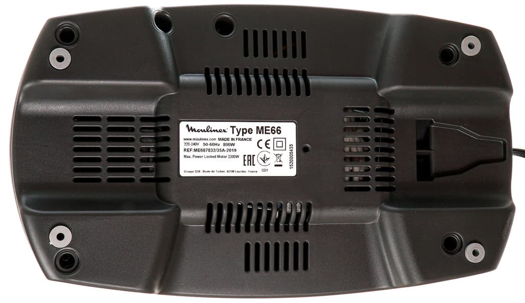 Со стороны дна мы не увидели ничего необычного: вентиляционные отверстия в изобилии, по центру — наклейка с технической информацией, по периметру — четыре ножки с резиновыми накладками для улучшения сцепления с поверхностью стола и уменьшения вибрации. Привлек внимание лишь отсек для закрепления вилки — справа на фотографии. Вилка туго вставляется в предназначенное для этого место, после чего корпус можно возвращать в обычное положение. Вместе с отсеком для размещения шнура это еще одно серьезное достоинство прибора.