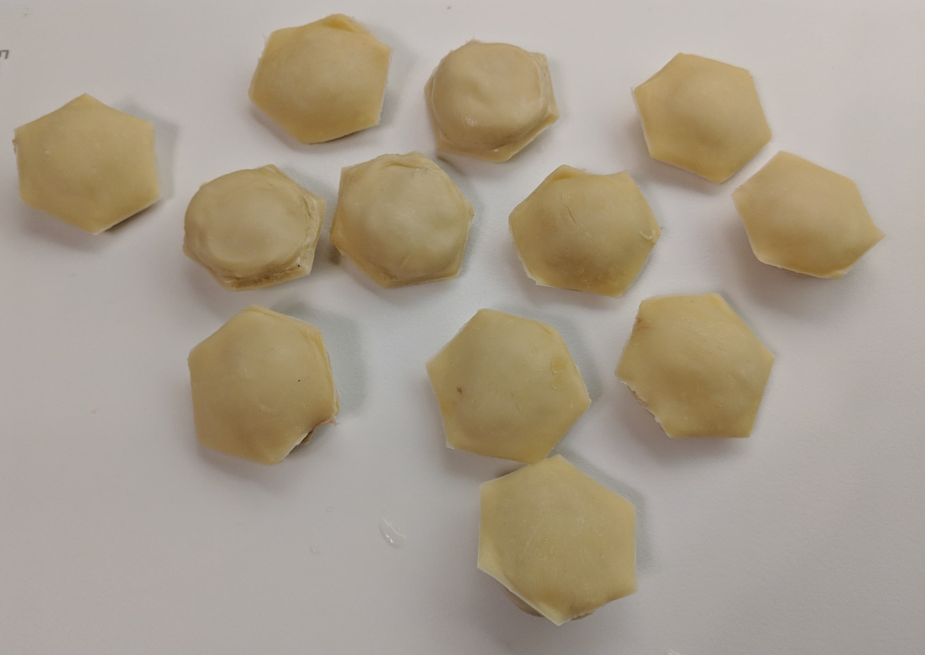 Сначала нам казалось, что ничего не выйдет, но настойчивость машины увенчалась успехом. Мы просто пошли раскатывать тесто, а когда вновь вернулись (минут через пять), обнаружили отлично вымешанный фарш, о который мы рук не пачкали.