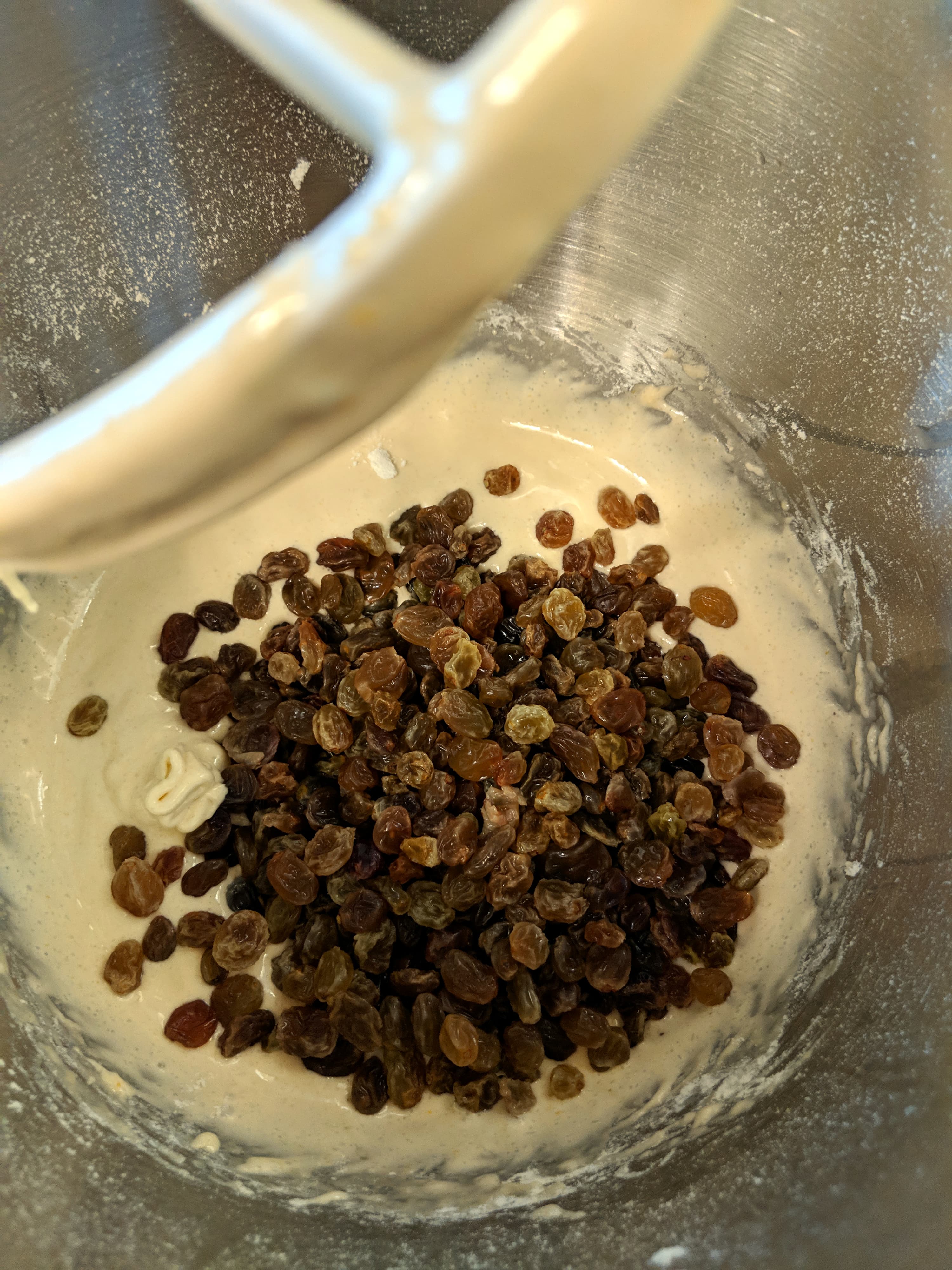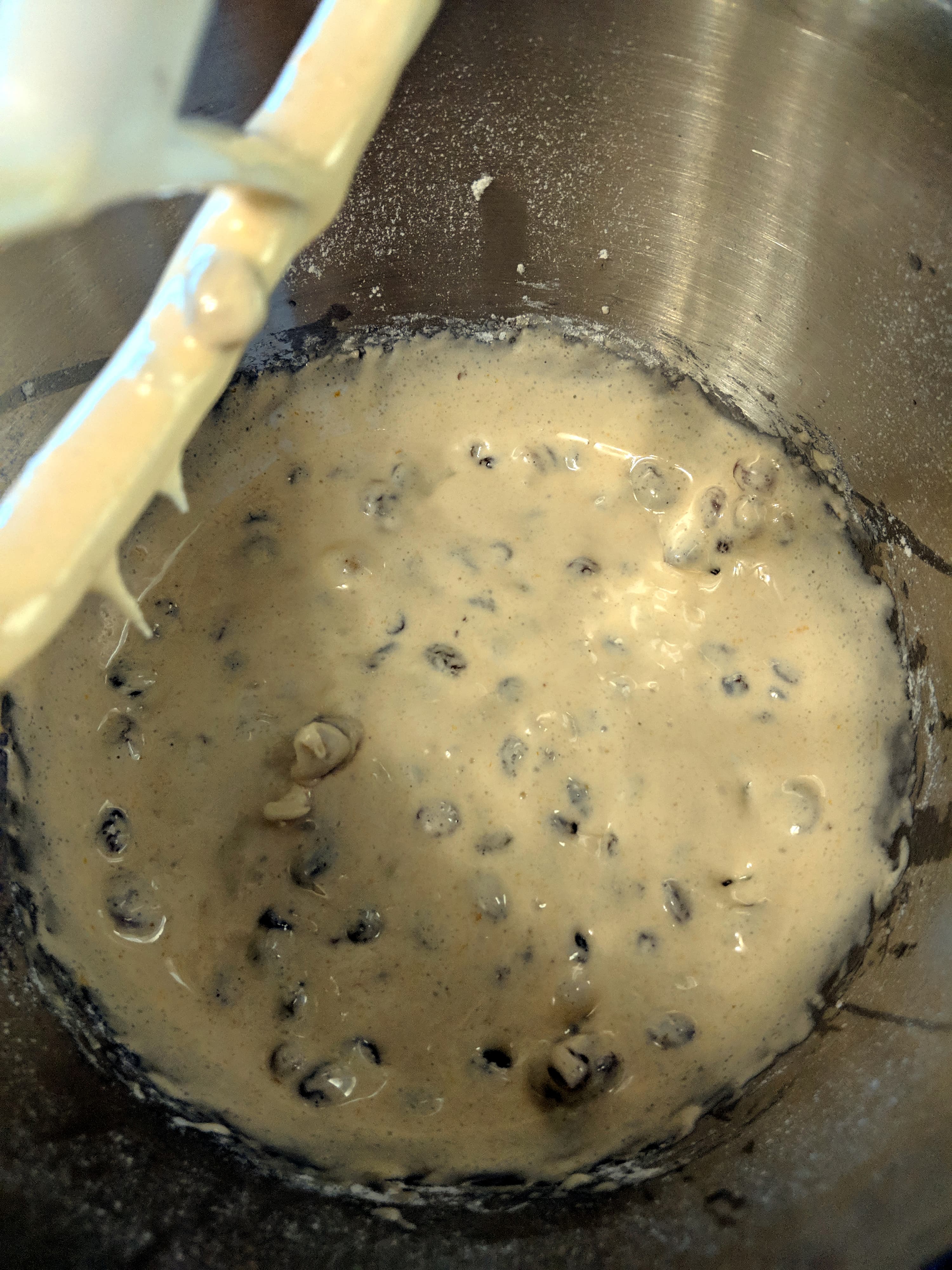 Более нежное тесто было представлено печеньем «Мазурка» с изюмом. С помощью венчика мы взбили два яйца со стаканом сахара. Поменяли насадку на мешалку и добавили стакан муки и полторы чайных ложки разрыхлителя. Когда гладкое тесто консистенции густой сметаны было готово, замешали с помощью той же насадки стакан запаренного изюма. Размешалось отлично. Ни разу не пришлось включать даже третью скорость.