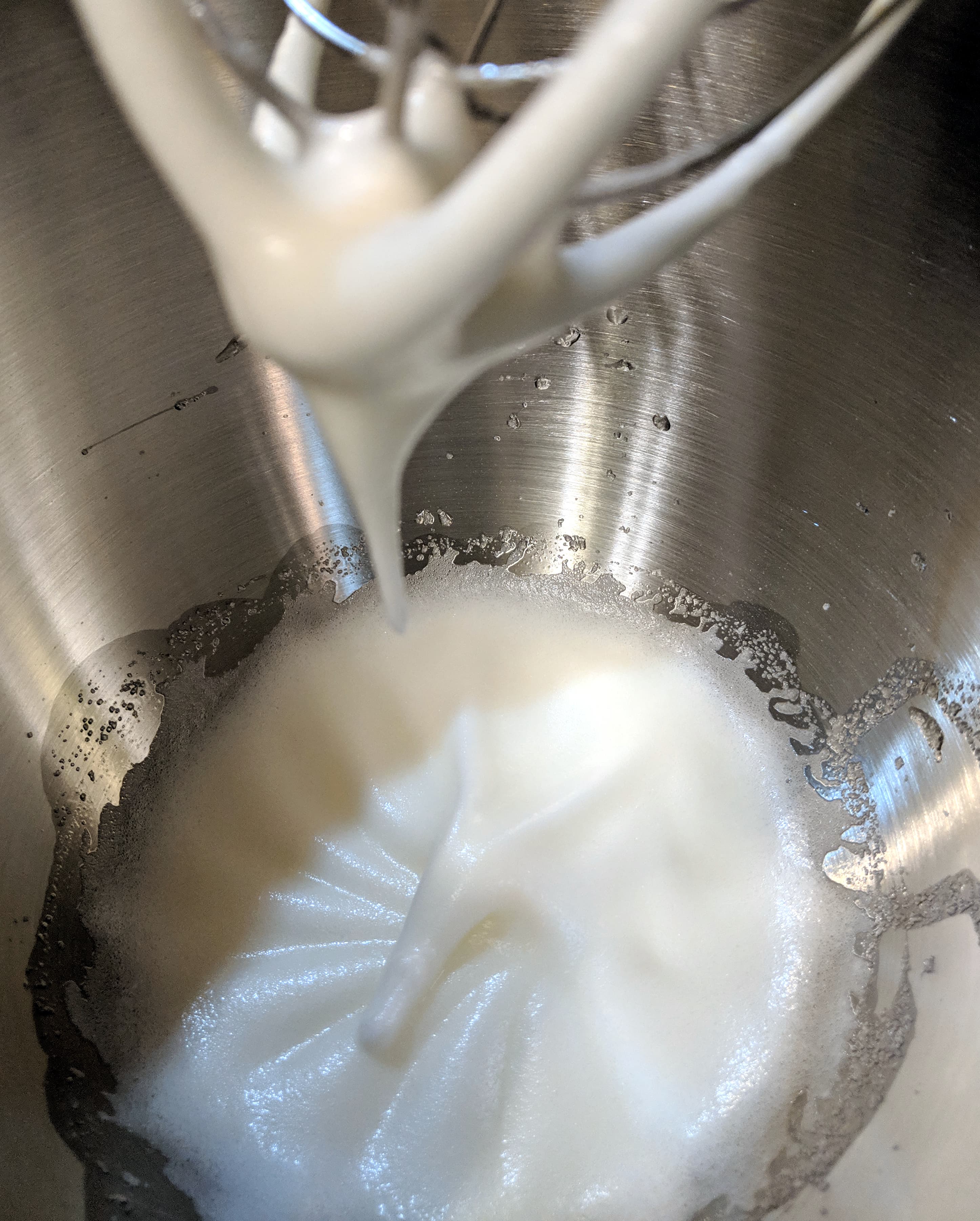 В прекрасно взбивающийся безо всяких дополнительных ухищрений белок мы добавили сахар, взбили до крепкой пены и использовали для украшения пирога меренгами.