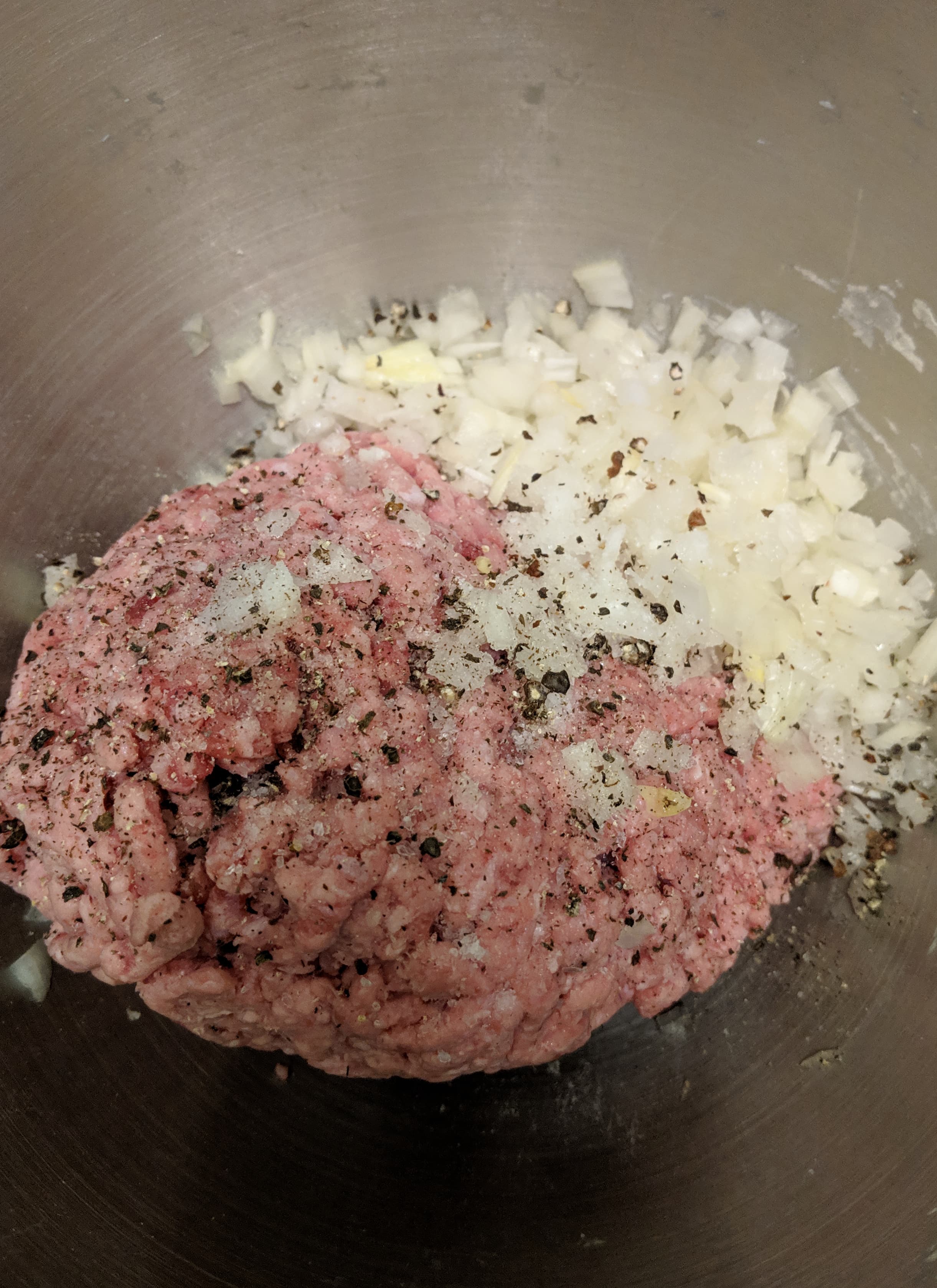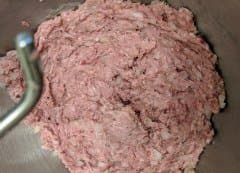 Фарш из говядины (70%) и свинины (30%) сложили в чашу, добавили соль, перец и мелко нарезанный лук и запустили перемешивание крюком на первой скорости.