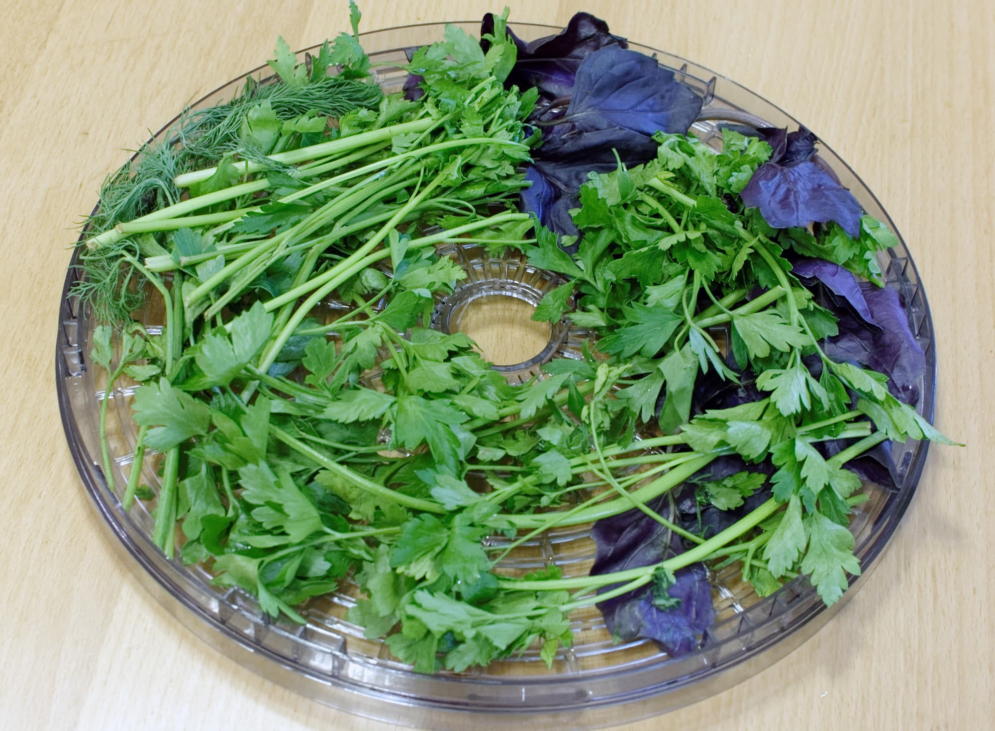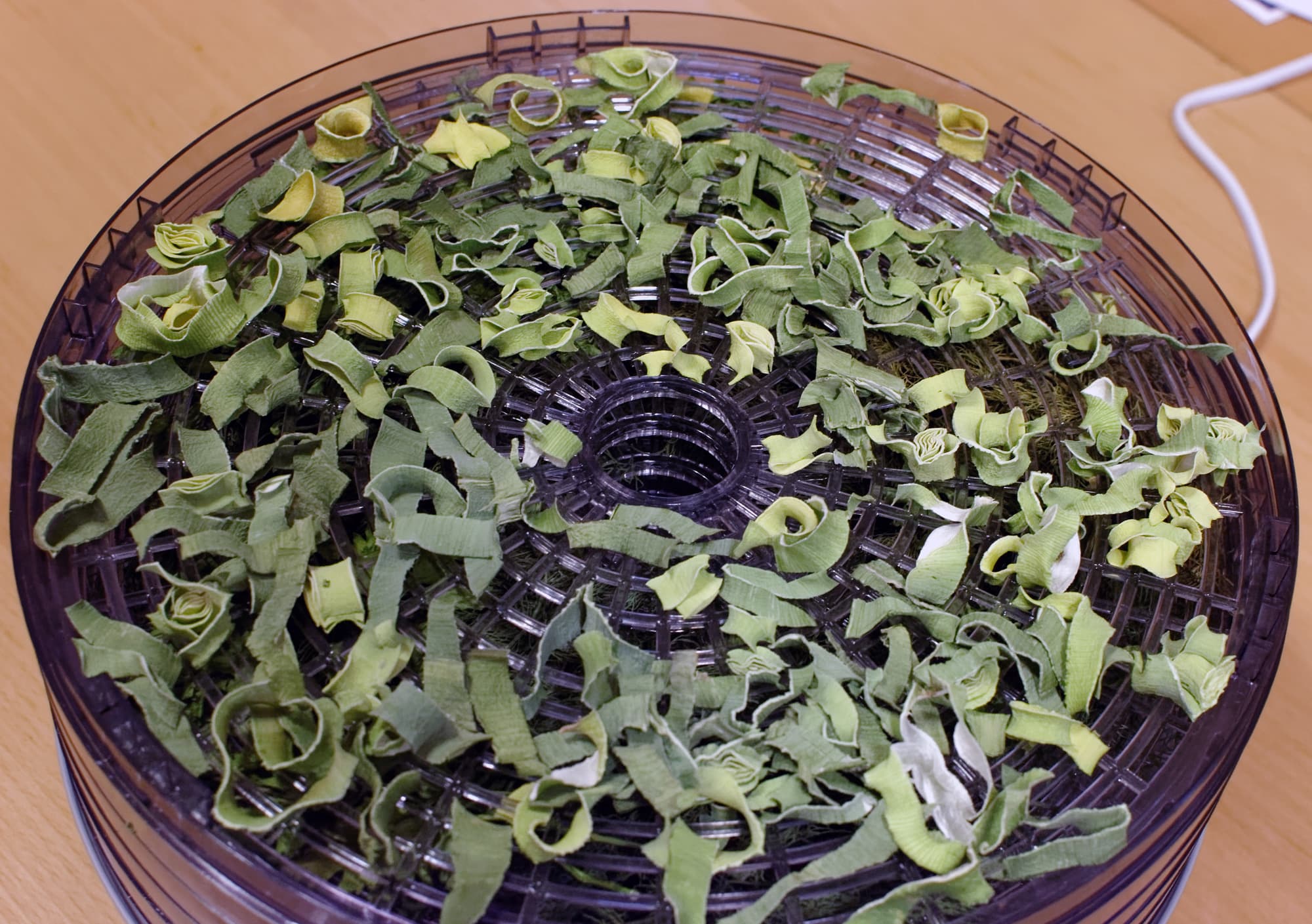 Своего рода «закрепляющий» тест — как правило, с зеленью может достойно справиться практически любая сушилка. Мы разложили на разных поддонах довольно пестрый набор: укроп, петрушка, зеленый лук, лук-порей и базилик. Всего 480 граммов.