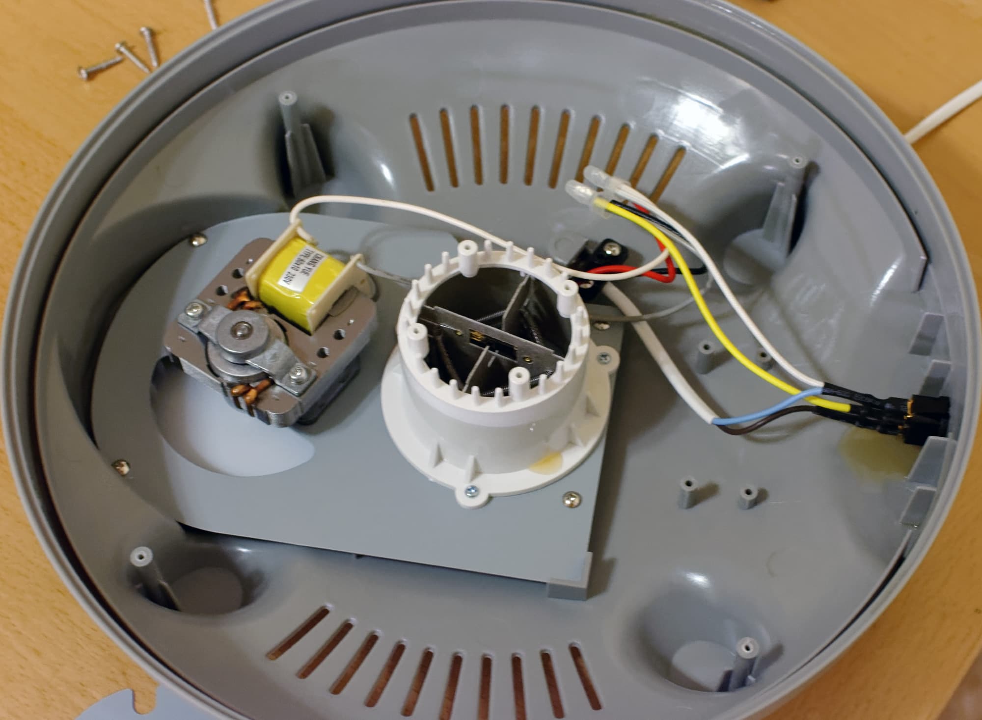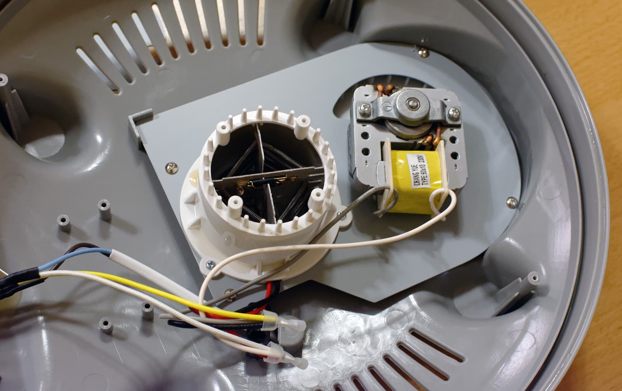 Грибок и крышку теперь стало можно замочить и потом отмыть под большим количеством проточной воды. Ну а заодно мы смогли заглянуть внутрь. Там все так же просто, как снаружи. Единственное, что немного удивило — для нагнетания воздуха используется не обычный вентилятор, а центробежный.