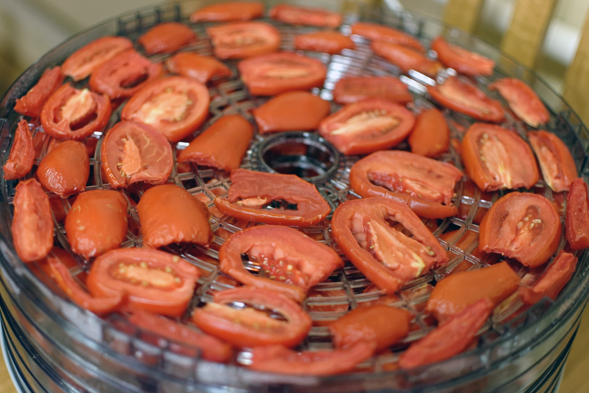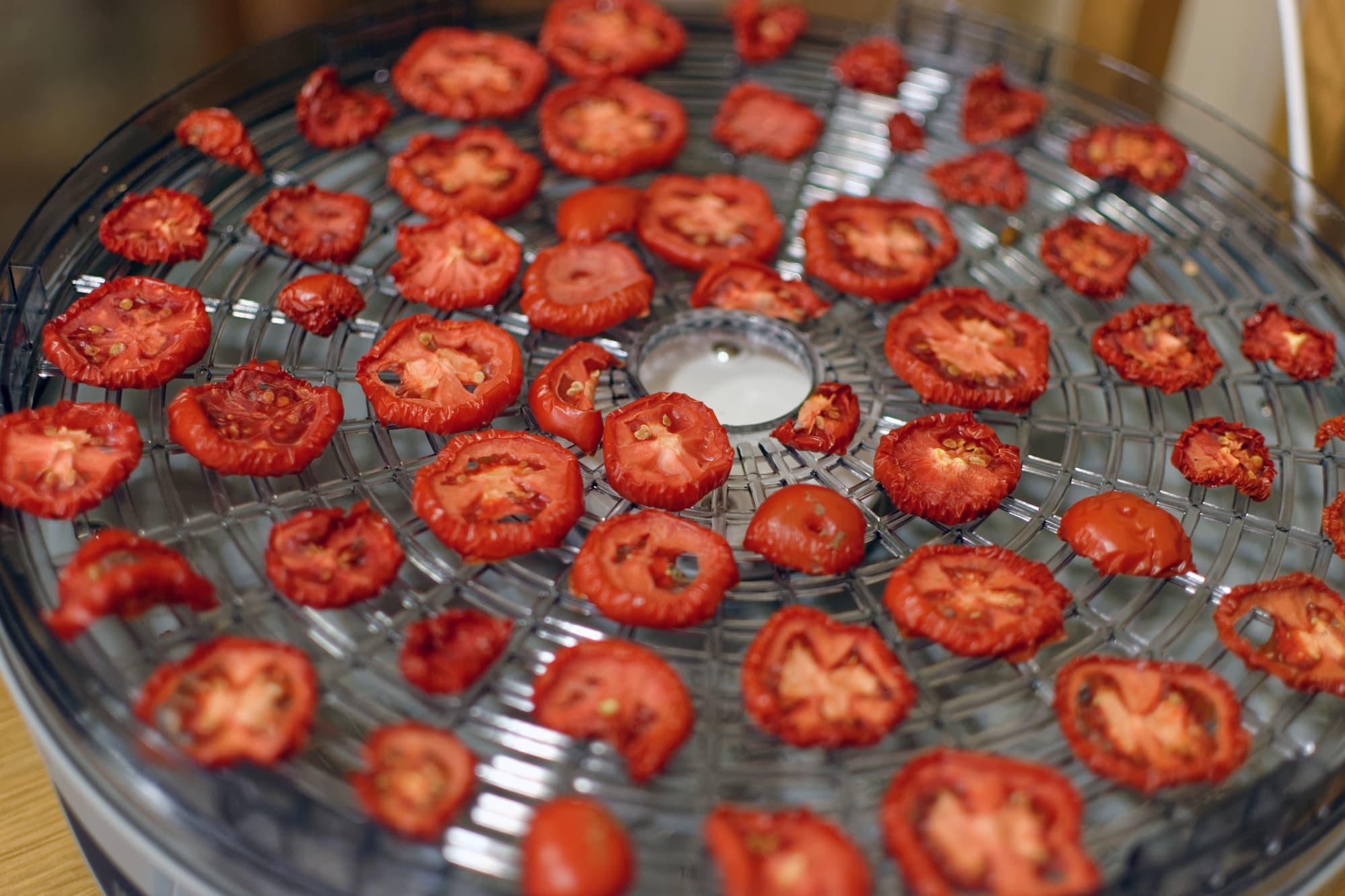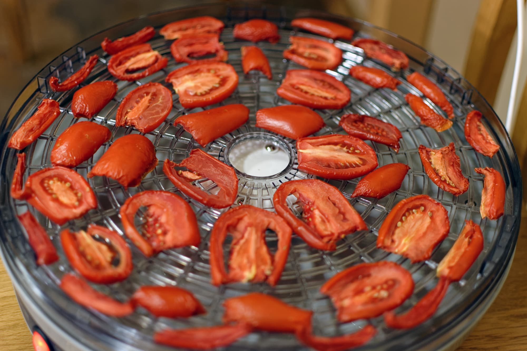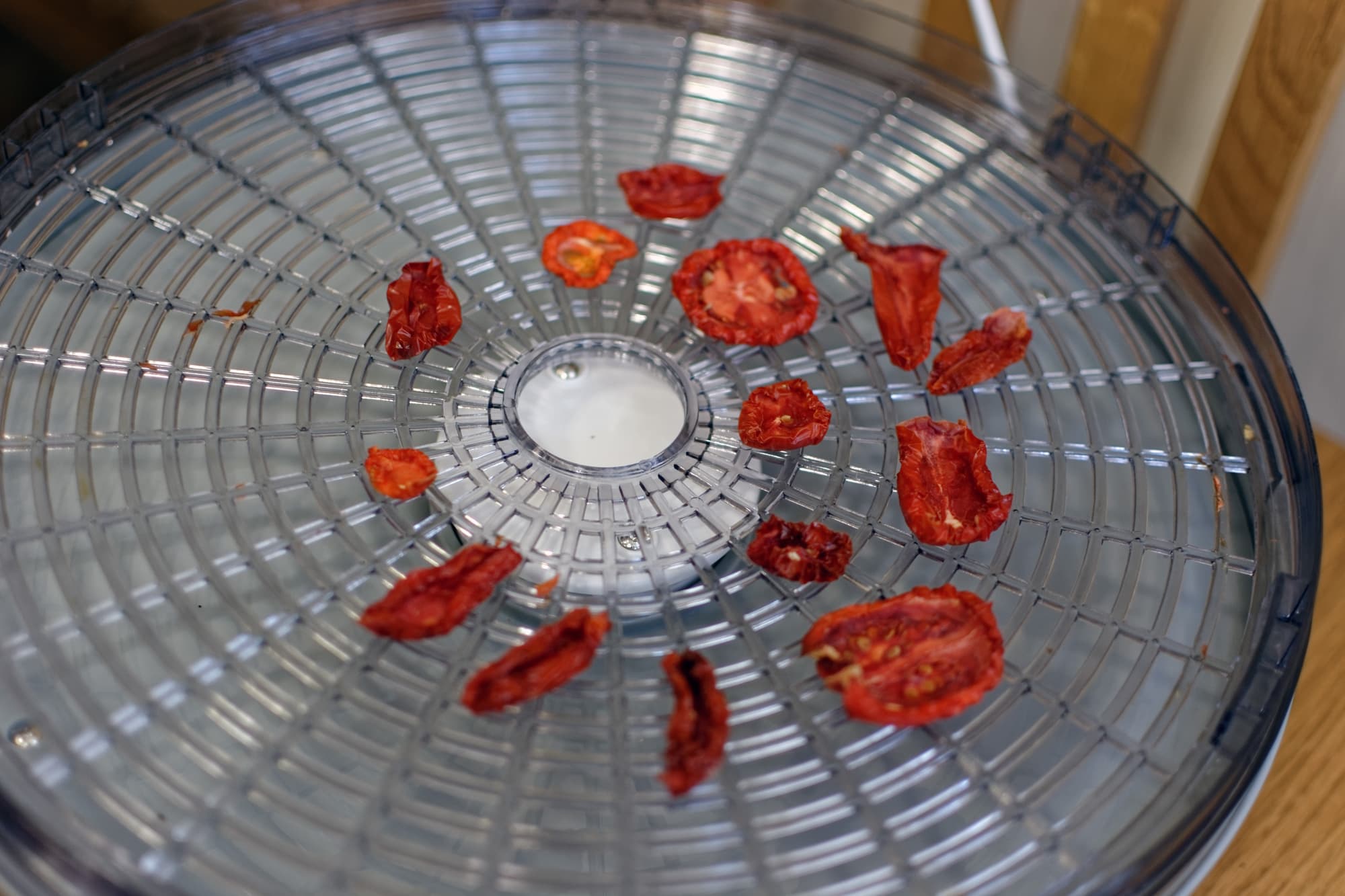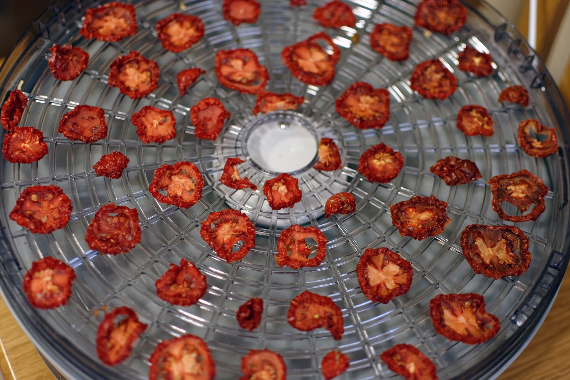 Через 2 часа мы поменяли поддоны местами, а заодно посмотрели, как себя чувствуют подопытные. Помидоры, нарезанные вдоль, были довольно влажными, лишь слегка подсохли.
