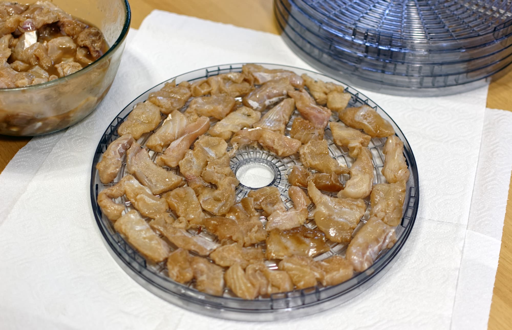 Однако, к нашему удивлению, часть кусочков все еще оставалась ощутимо влажной. Мы выложили их на одну сетку и досушивали на ней отдельно еще 4 часа (чтобы уж наверняка).