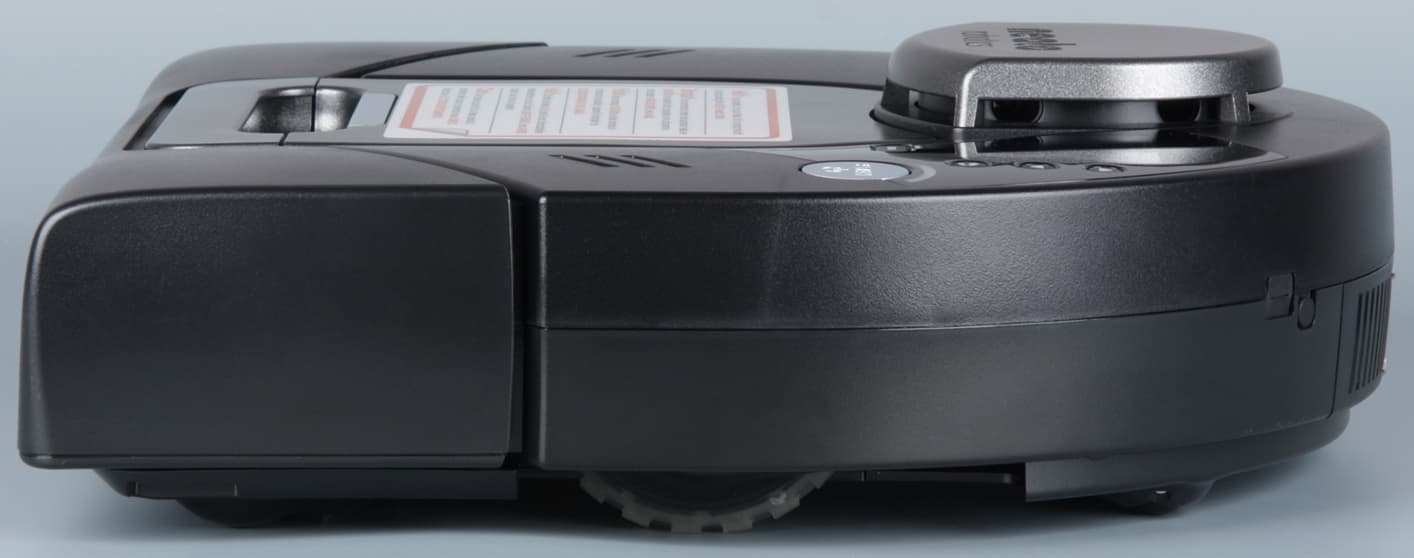 Небольшой скос спереди снизу помогает роботу преодолевать препятствия. Материал корпуса — это в основном черный (с небольшой вариацией оттенка) пластик с матовой поверхностью и, видимо, без покрытия, что в итоге уменьшает заметность повреждений. Исключение — верхняя передняя часть отсека пылесборника, крышка пылесборника и башенка лидара — они сверху имеют темно-серебристое покрытие. Сверху слева от указанной башенки располагается контрольная панель с механическими кнопками: три мелкие для навигации по меню, одна побольше функциональная и большая серебристая запуска; с относительно большим графическим монохромным ЖК-дисплеем и светодиодным — оранжевым/зеленым — индикатором состояния, огибающим кнопку запуска. Прикрыта контрольная панель вставкой из прозрачного пластика, которая легко царапается и на которой заметны как царапины, так и следы от пальцев. В передней части корпуса с заходом на боковые поверхности установлен механический бампер.