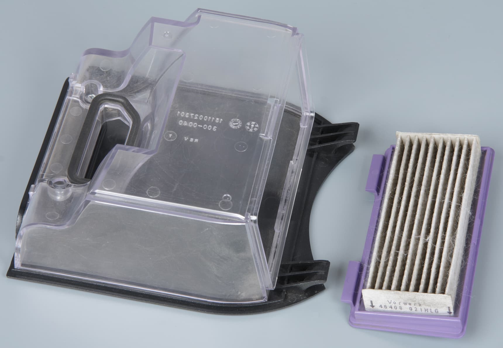 Стальная ось щетки вращается в двух подшипниках из цветного сплава, установленных в упругие пластиковые виброизолирующие втулки. Снятие и установка щетки немного затруднены тем, что пользователю приходится снимать и надевать приводной зубчатый ремень. Сразу за щеткой расположен желобок-воздуховод, переходящий в центре во всасывающий патрубок, состыкованный с входным отверстием пылесборника. Корпус пылесборника изготовлен из прозрачного пластика, но его крышка все равно непрозрачная, поэтому, не вынув пылесборник, невозможно оценить его фактическое заполнение. Но хоть опустошение проконтролировать можно.