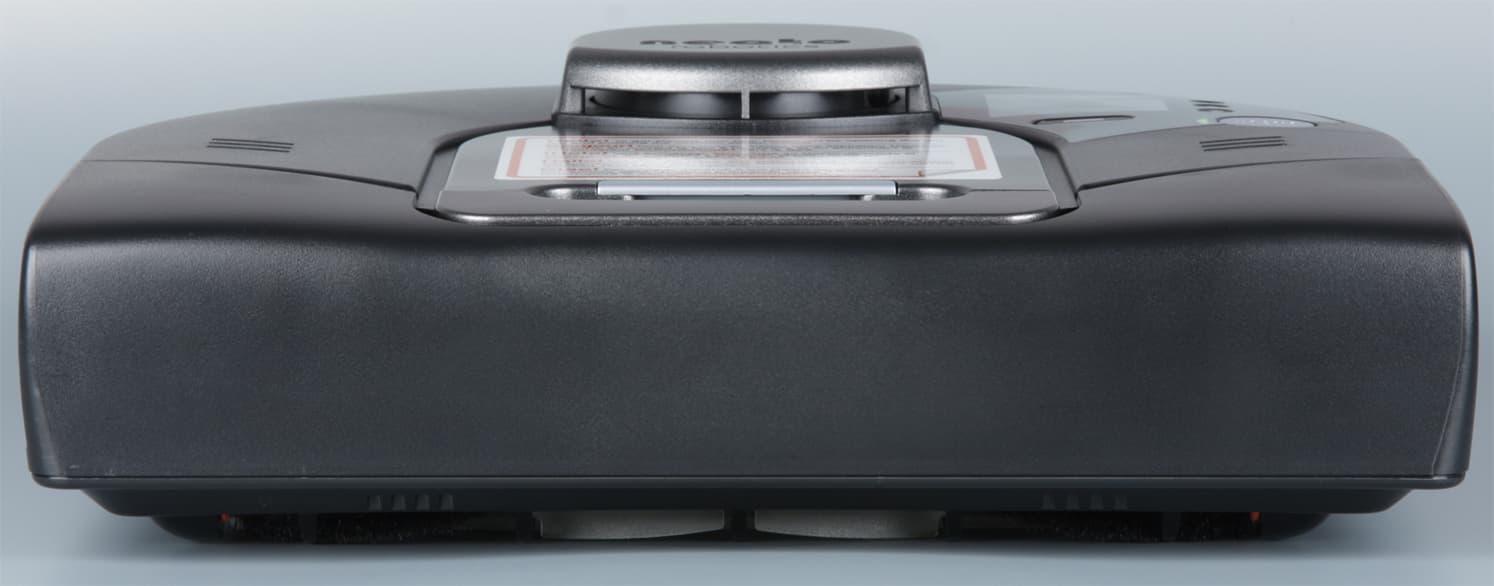 В плане задняя часть корпуса традиционно круглая (вернее полукруглая), но спереди корпус переходит в прямоугольную часть без изменения ширины. Такая геометрия продиктована отсутствием боковых щеточек, из-за чего основную щетку потребовалось сдвинуть максимально вперед и расширить почти до габаритов — только так можно рассчитывать хоть на какое-то качество уборки в углах помещения. В итоге ширина основной (и единственной) щетки составила целых 238 мм, от щетки до края корпуса остался промежуток в 40 мм, а спереди — порядка 25 мм. Робот несколько угловатый, что снизит вероятность того, что он будет застревать под препятствиями с небольшим просветом, впрочем, основную роль тут будут играть фирменная система обнаружения препятствий.