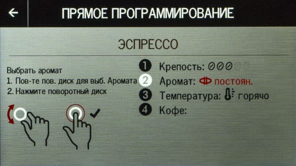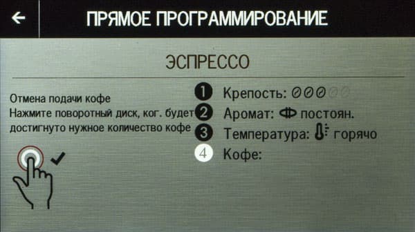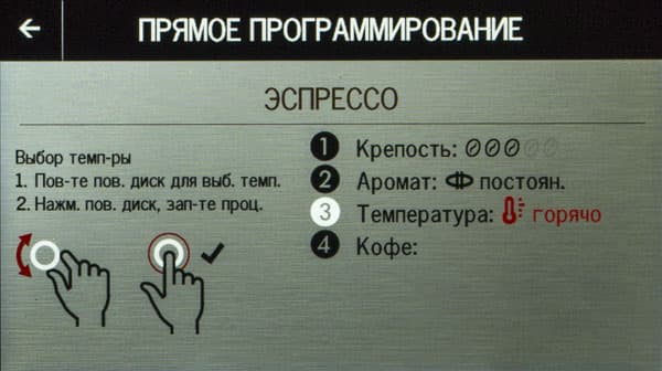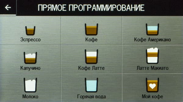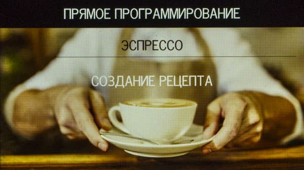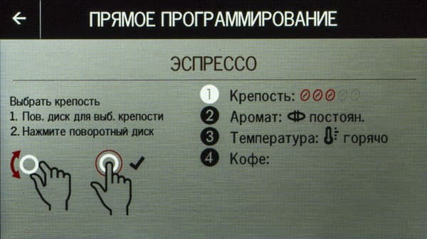 Первый из них называется «Прямое программирование», смысл его понятен: задание параметров всех возможных напитков. Но целесообразность наличия в меню такого раздела может вызвать сомнение, ведь то же самое можно сделать с основной страницы: длительным нажатием войти в режим установок для какого-то напитка, внести изменения и нажать «Сохранить». Оказывается, разница не только в оформлении: последним действием при прямом программировании будет приготовление порции с предложением нажимать кнопку «поворотного диска» по достижении желаемого объема для каждого компонента напитка. Можно сказать, что при этом мы подстраиваемся под чашку или бокал, а не задаем объемы в миллилитрах.