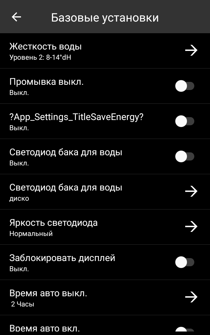 Набор системных (не относящихся к приготовлению напитков) настроек тоже немалый. Часть мы уже упоминали — подсветка бака с водой, выбор языка, кратко пробежимся и по остальным.