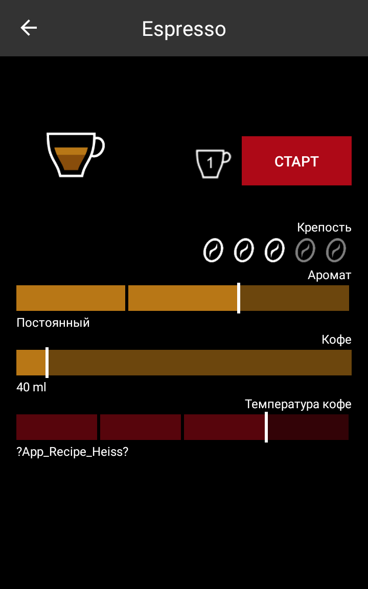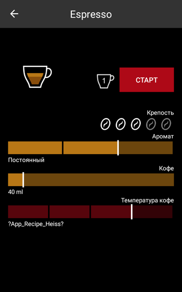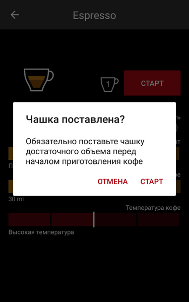 Приготовление происходит не сразу после нажатия соответствующей иконки приложения, а непременно через страницу с настройками рецепта; если ничего менять не надо, просто нажимаем на ней «Старт». Как и для панели управления машины, процесс можно прервать в любой момент.