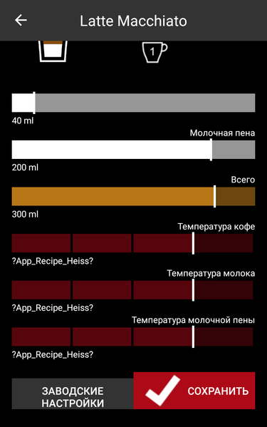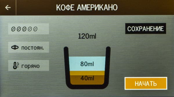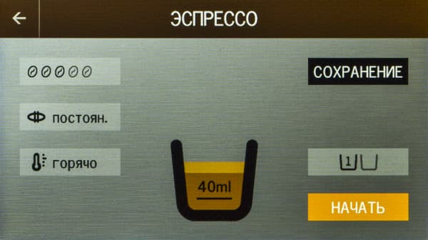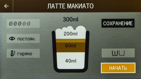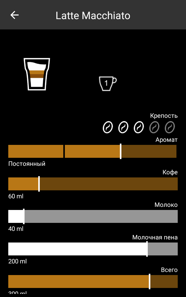 Короткое касание любой иконки (кроме «Мой кофе») инициирует приготовление, длительное — переход к настройкам. Для чисто кофейных напитков можно регулировать крепость (пять ступеней), температуру (четыре градации), объем в миллилитрах (шагами по 5-10 мл) и количество чашек (одна или две).